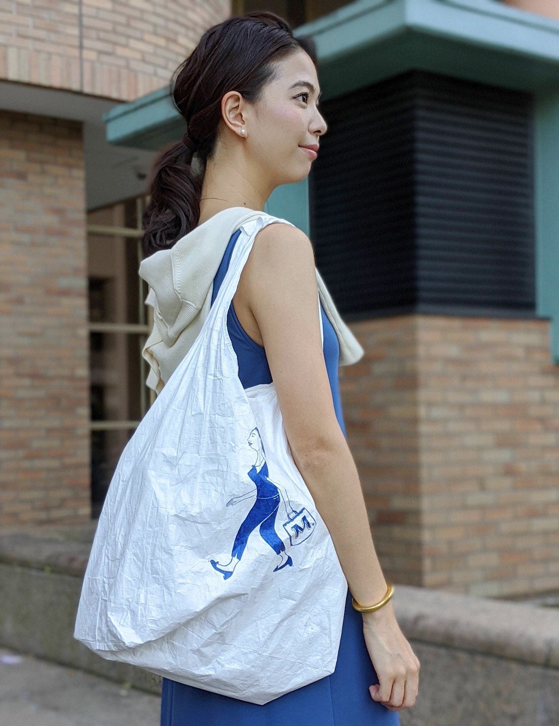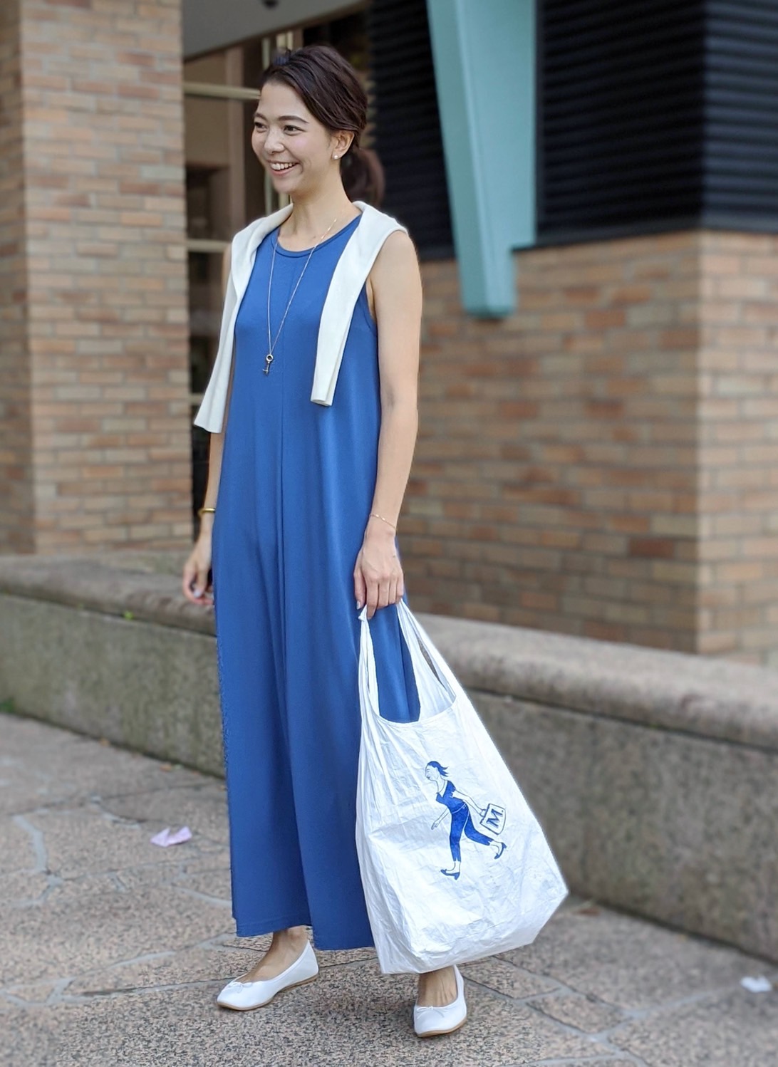 エコバッグのペイントがブルーなので、合わせてワンピースもブルーにして全体的に色味を統一しました。