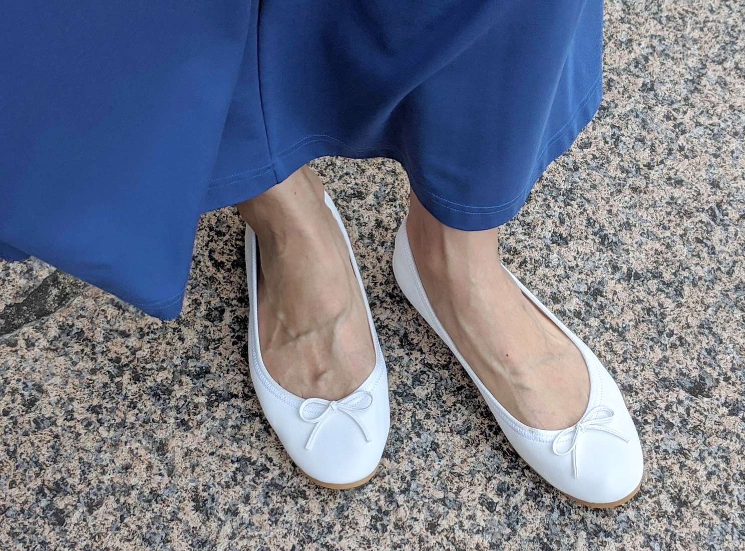 足元は楽チンな軽いフラットシューズに。スニーカーも⚪︎ですが、エコバッグがカジュアルなので、綺麗目な真っ白のフラットシューズだとコーディネートが引き締まって◎です!