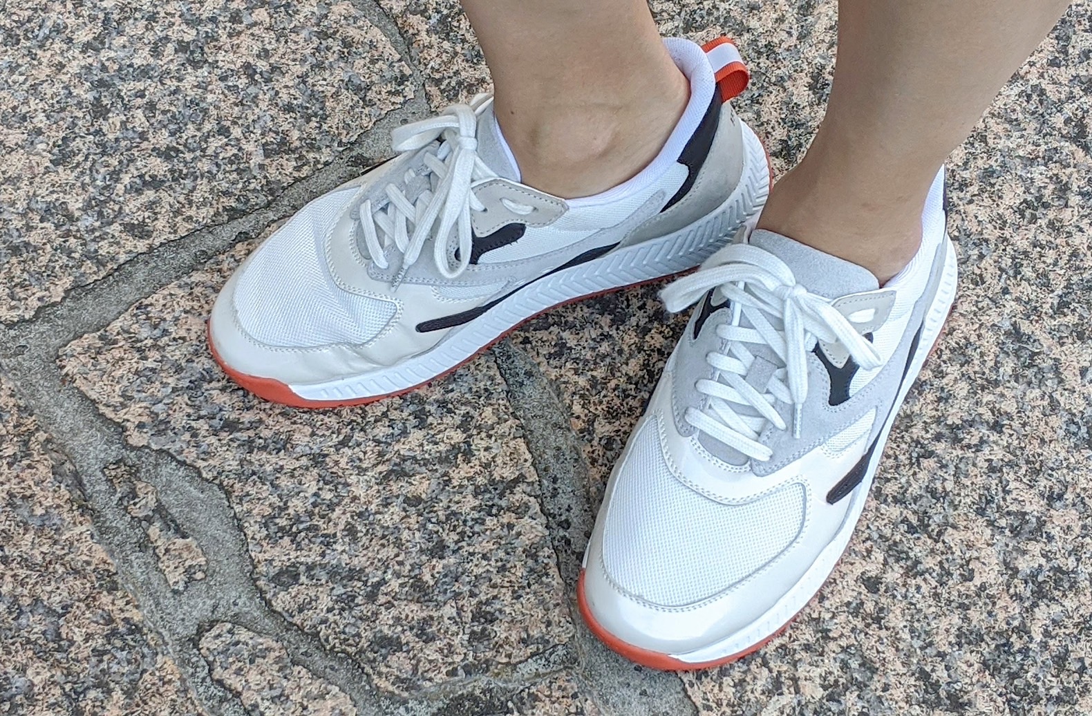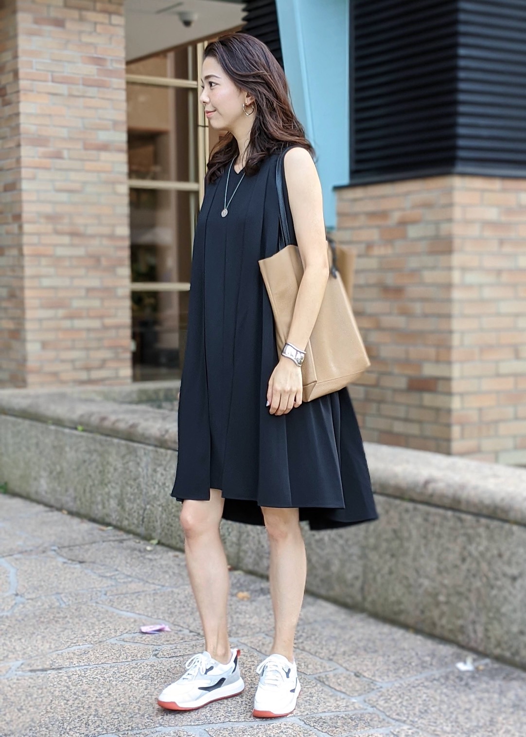 足元はスニーカーに。膝丈ワンピースにはスニーカーがMy定番です。オレンジの色味が秋らしいポイントになっています。