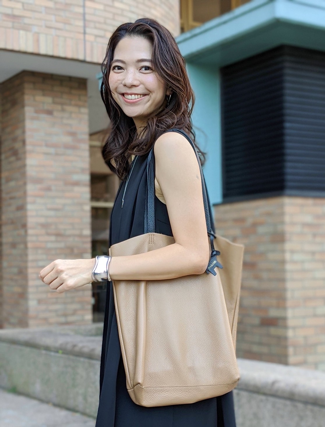 ベージュ×黒はどんなコーディネートにも合わせやすく、レザーがコーディネートをきちんと見えさせてくれます。