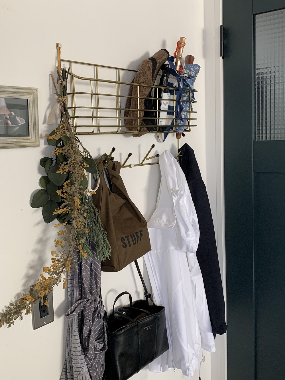 「玄関近くに上着や日傘などをまとめて収納できるラックを取り付けています。ウイルスや花粉を部屋の中まで持ち込むことに抵抗があるので安心できます。一度外に出てからやっぱり上着などを持っていこう、と思ったときもすぐ手に取れるのも便利です。(ラックはACTUSで取り扱っているMITTEN SHELF/W57×D8.4×H34㎝・素材は真鍮メッキ仕上げのスチール)」(新宿店副店長:Kさん)