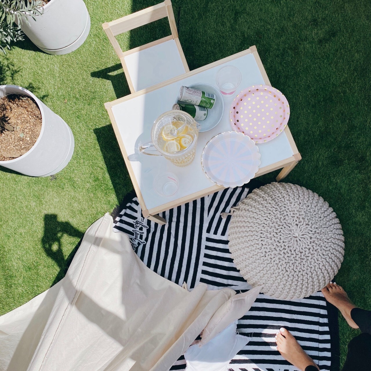 食器やグラスは割れる心配がないよう、全部プラスチックや紙にしています。アルコールは「成城石井」や「ナショナル」で売っている缶のスパークリングが、ボトルより楽で安心安全!「フライングタイガー」、「ZARA HOME」、「ダイソー」、ネットなどで可愛いものを見つけてはストックしています。