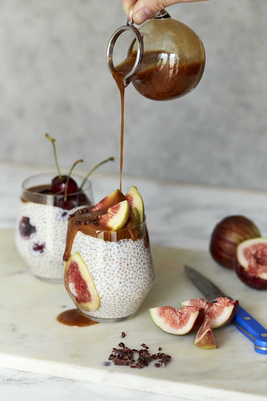 3.器にフルーツとともにチアシードプリンを盛りつけ、キャラメルソースをかける。お好みでカカオニブをかける。