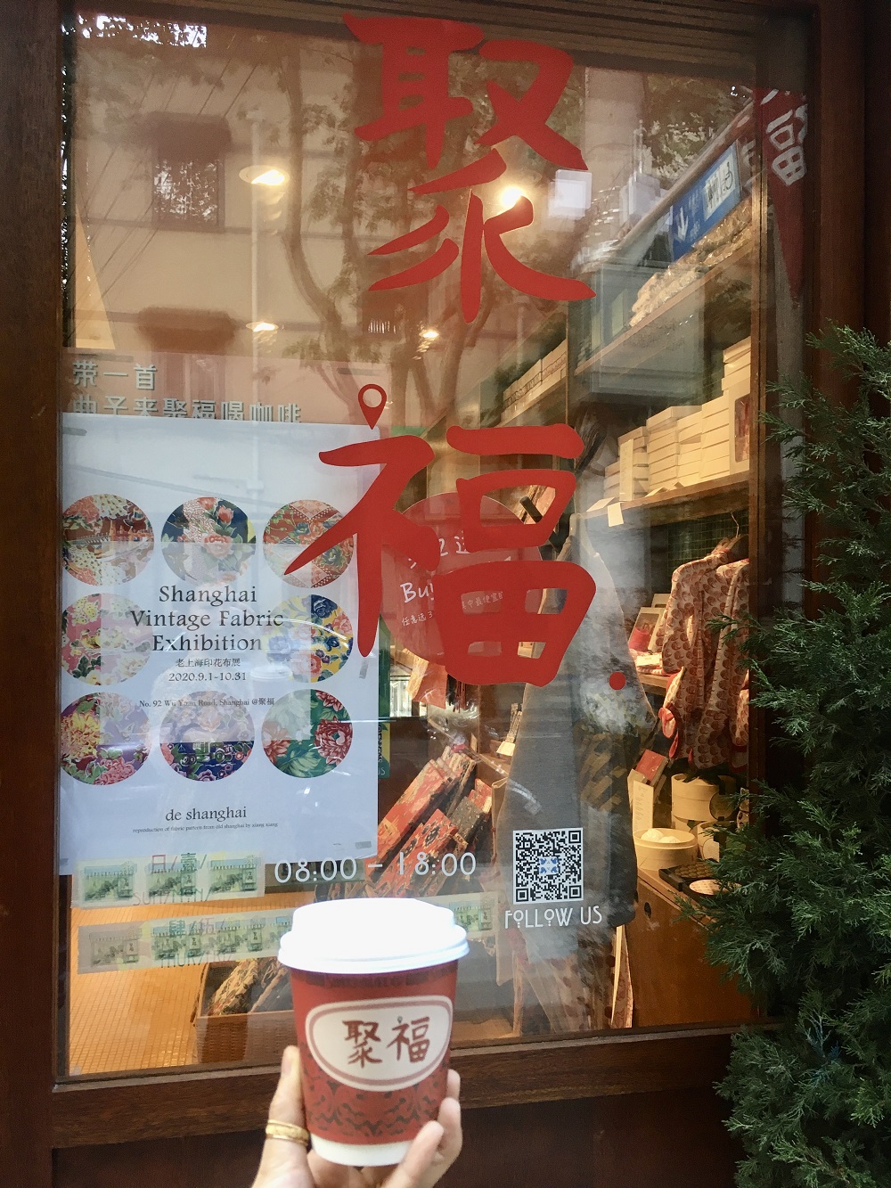 上海では最近、中国語のロゴデザインが人気。エコバッグとしてではなくメインのバッグとして流行っているトートバッグにプリントされた文字が中国語で「開心」(=Happyの意)だったり、近所のおしゃれなカフェの店名が「聚福」(=福が集まる)だったり。こちらのお店は中国のキッチュでおしゃれな絵柄の琺瑯や生地を使ったインテリアで、雑貨販売も。中国語をおしゃれなロゴとしてデザインするのが流行っていて、縁起のいい言葉を見かけると御利益がある気がしてほっこりします。
