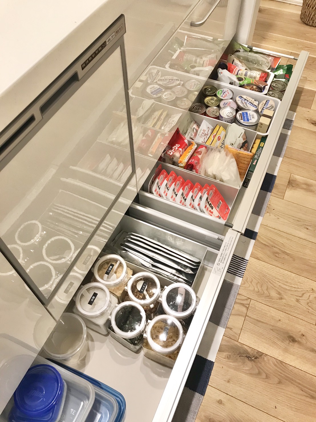 食品は日常に使うものと非常用として使えるものを一緒に管理し、非常食の賞味期限が切れないように、食べてまた買う、というサイクルに。以前は食品のストックを大きい深めのボックスで管理していましたが、見えないものは忘れてしまい、気が付くと賞味期限が切れていることも。立てて収納すれば、メニューも決めやすい、在庫量も分かりやすい、家族にも一目瞭然で不要な外食も減らせるかも!