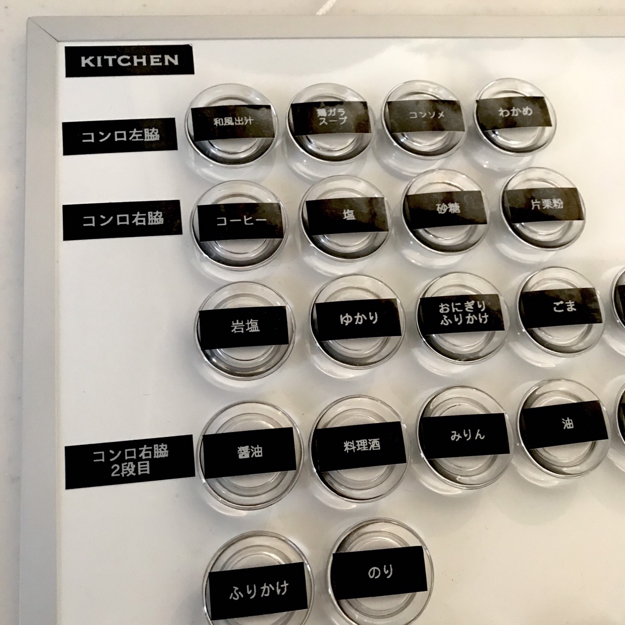 こちらはキッチン類のお買い物時に在庫を確認する管理ボード。買い物へ行く前に、このボードで確認しながら買いたい物のマグネットをボード右側に移動、最後にスマホで撮影し、お店で写真を見ながら購入。上記の一軍調味料など毎回定番で購入しているものや、切らしたくないモノだけをマグネットに記入しています。買い物時の時短はもちろん、買いすぎ防止になり、キッチンが物で溢れることもなくなりとても快適。