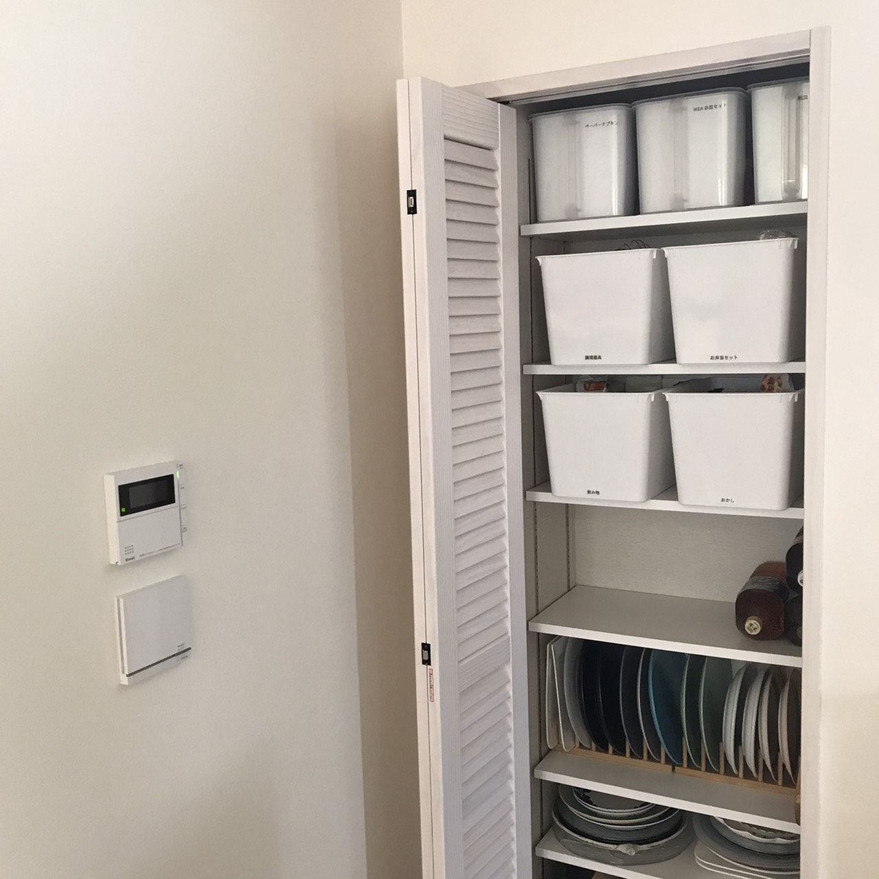 キッチンは瞬発的にモノが増えがちな場所。たとえば贈り物を頂いたり、うっかり買いすぎてしまったり、イベント前の大量の買い込みなど。そんなときのために、一時的に増えたモノを置く臨時収納場所として、必ず一段空けています。ここがあれば、キッチンが散らかることもなく、安心です。