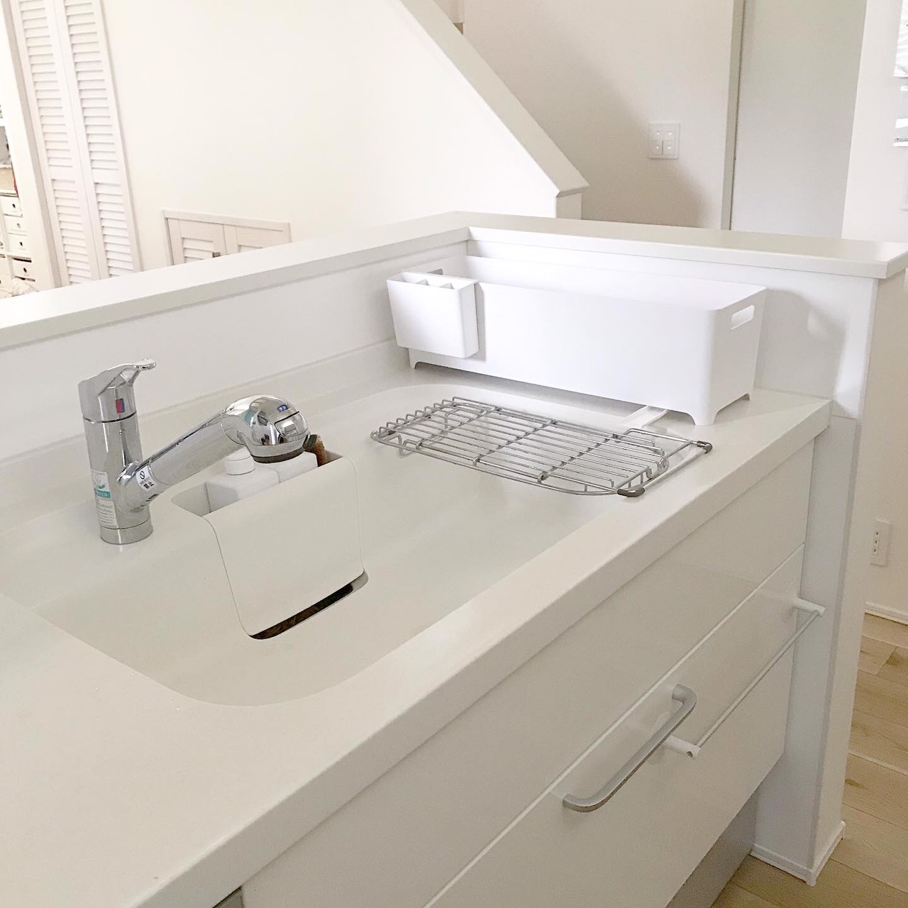 キッチンの広さは三帖ほど。我が家のキッチンのこだわりは料理スペースを広く確保し、掃除を簡単にするため、基本は何も外に置かないように。本当によく使う一軍のものだけに、特等席の収納場所を与えています。キッチン家電や食器棚は、白で統一。壁と同化させ部屋全体を広く明るく見せる効果を演出。キッチンはモノの出入りが一番激しい場所です。