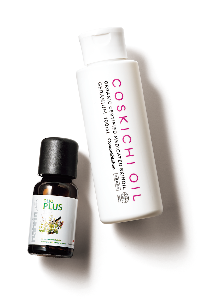 左から「直接肌に塗れるエッセンシャルオイル。鼻の下に塗ったり、香りが持続するのでマスクに垂らすのもおすすめ」ナリン ハーブオイル33+7 15mℓ ¥2,700「オーガニックで薬用は世界初! どんな肌質の方でも使えて、顔も体も肌の炎症を抑えてくれます」コスキチ薬用オーガニック認証スキンオイル ゼラニウム[医薬部外品]100mℓ ¥1,800(ともにコスメキッチン)