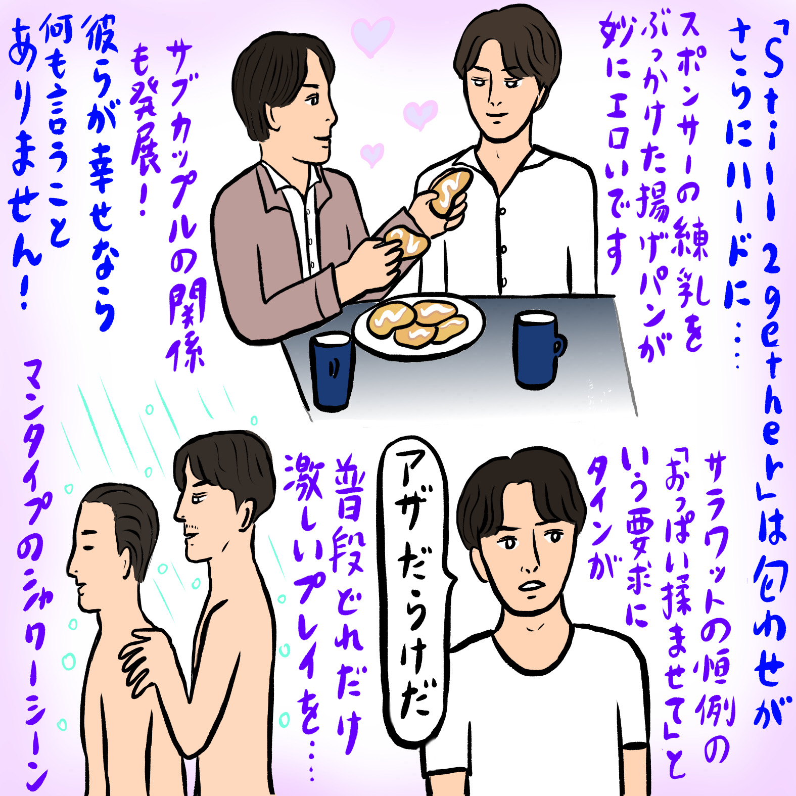 多幸感があふれて、何度でも観たくなる「Still 2gether」。観た後は幸せの余韻で脳髄が痺れ、しばらく仕事や学業が手につかなくなってしまうかもしれませんが、愛のパワーを補給して、さらに活力が高まっていることでしょう。GMM TV様には来年も引き続き生きる希望をよろしくお願いいたします。