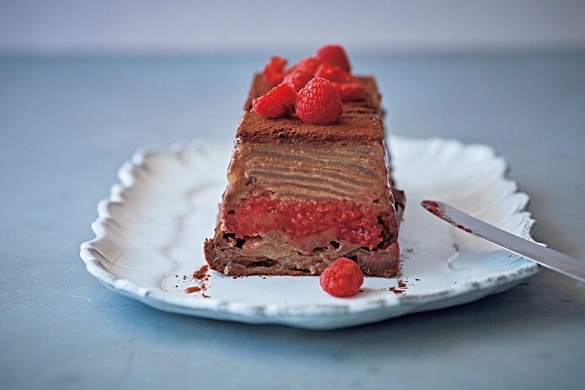 8.天板に7をのせてオーブンに入れ、170℃で50分ほど焼く。オーブンシートの両端を持って型から取り出し、よく冷ます。器に盛り、ココアパウダーを振ってラズベリーを散らす。