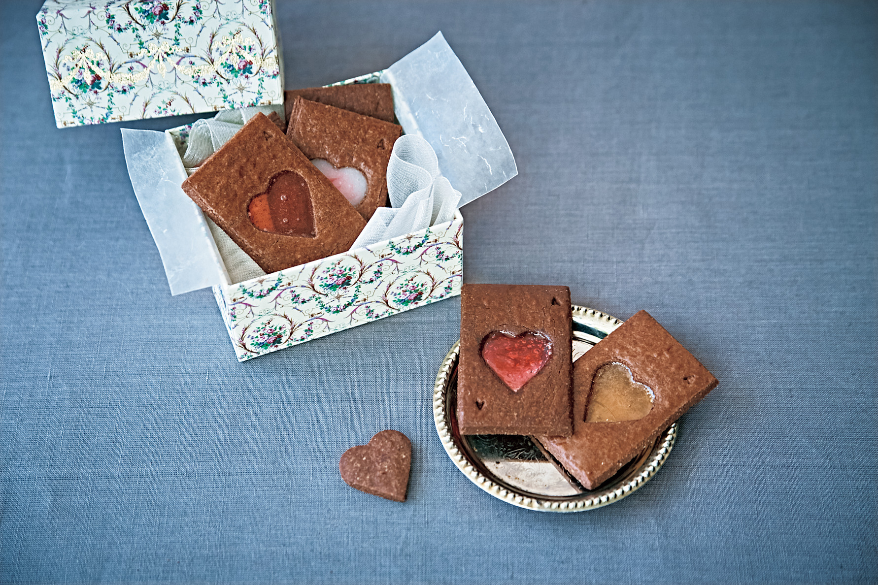 3.ラップ2 枚を切って十字に重ね、中央に2をのせて20×16㎝になるように包む。ラップの大きさに合わせて、生地をめん棒でのばす。ラップを外して、表面に打ち粉(分量外)をして、縦・横それぞれ4等分の大きさに切り、中央をハート形の型で抜く。あれば隅に「A」のスタンプを押す。オーブンシートを敷いた天板に3をのせ、170℃のオーブンで7 分ほど焼く。ハート形にいた部分に飴を入れ、オーブンで3分ほど飴が溶けるまで焼く。
