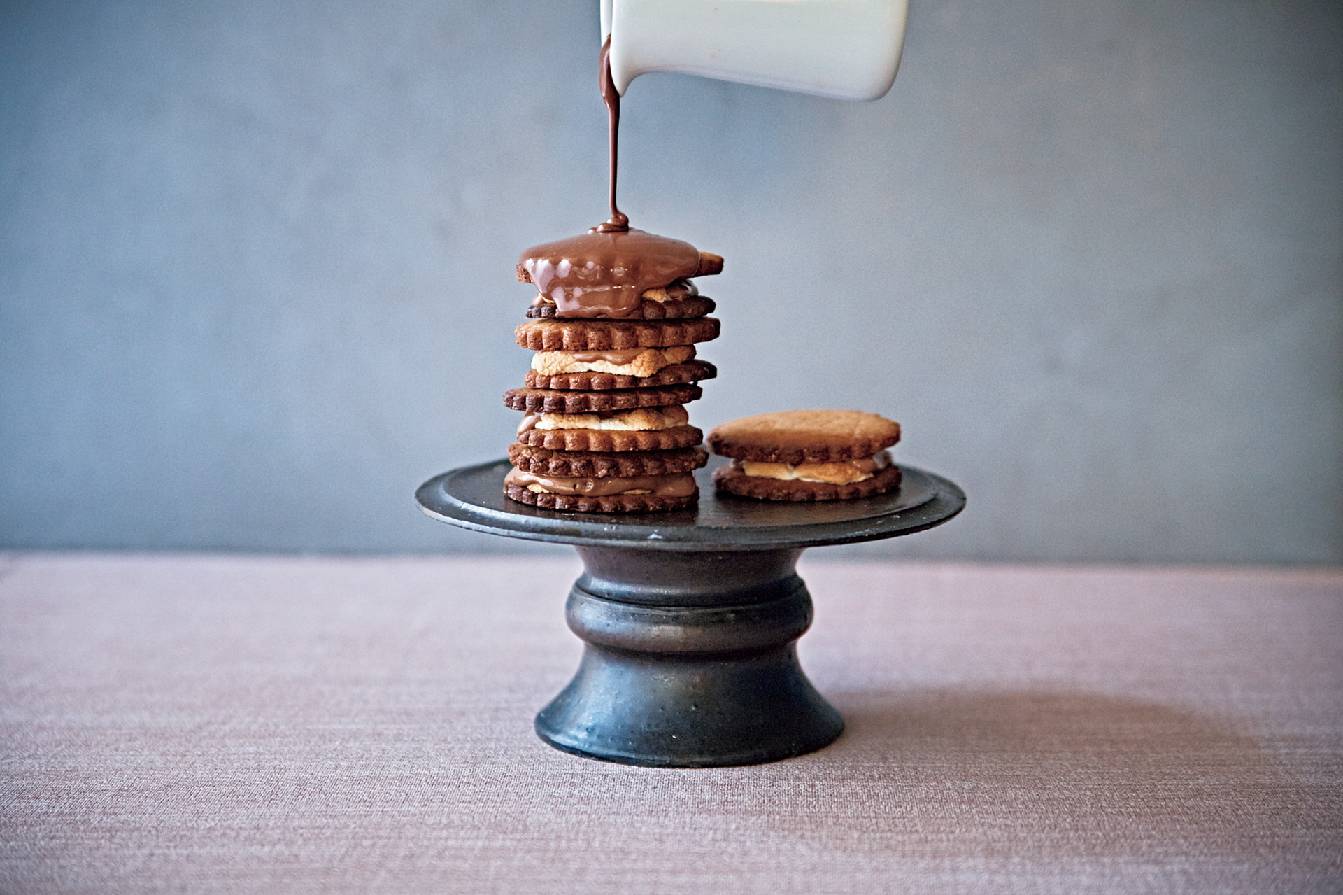 5.4の半量にマシュマロをのせ、オーブンで1分ほどマシュマロが色づくまで焼き、板チョコとりのクラッカーを重ねる。器に盛り、ガトー・インビジブルのと同様に作ったチョコソースをかける。