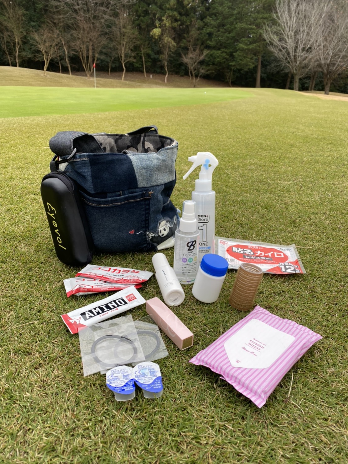 疲労回復用のクエン酸とアミノ酸「ココカラダ」は、個包装になっているので持ち運びに便利!同伴ゴルファーたちに配るとめちゃくちゃ喜ばれるので、できる女子アピールとして常に持っています(笑)。忘れると何かと不便なので、ヘアゴムの予備やコンタクトレンズも欠かせません。ラウンドは乾燥するので、予防のスプレー、ハンドクリーム、エスティーローダーのグロス、エチケットとして除菌スプレーや汗拭きシートもマストアイテム。マジックカーラーは、ランチのときやゴルフあとのペシャンコ前髪対策に!