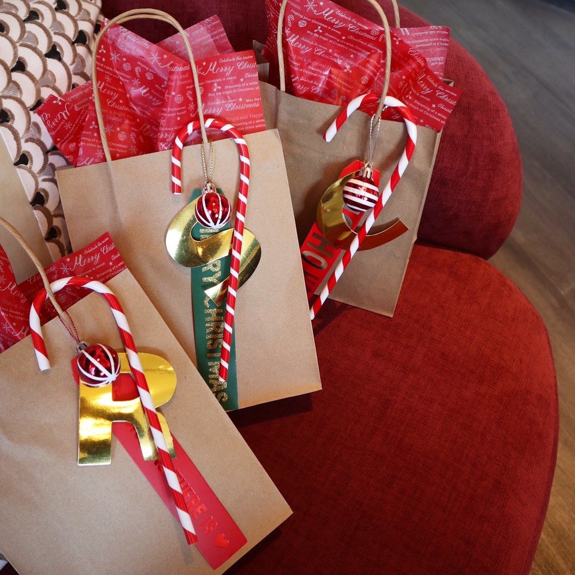 「ツリーにオーナメントつけるように、小物やタグを引っ掛けるだけで、ただの紙袋が特別なギフト仕様に。たとえ中身がちょっとしたお菓子だとしても、嬉しさがアップしますよね。薄い色紙で中身が見えないようにする“海外のラッピング”風に、お菓子作り用のワックスペーパーをガサッと入れてアレンジしました。イニシャルのタグは、それだけでパーソナル感が出るので、相手にも喜んでもらえておすすめ。最近はプレゼントをもらった後にすぐ写真を撮るコが多いので、その時に少しでも盛れるように意識しました」(清水さん)