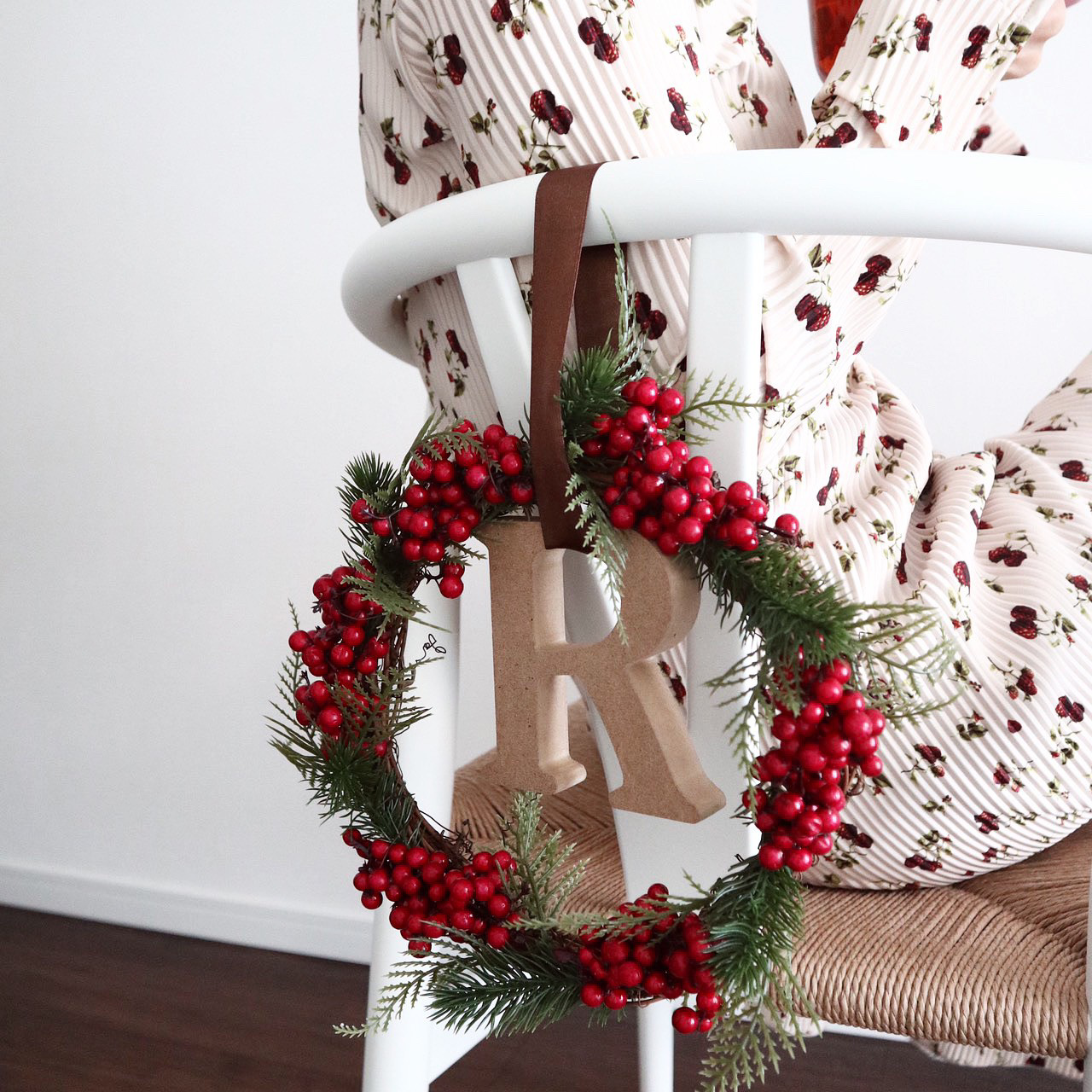 「飾りつきのリースとDIY用のイニシャルパーツにリボンを通し、ホチキスで留めるだけでOK。たった3分でオリジナルのリースが完成します。扉にかけるのは当たり前なので、あえてダイニングチェアに吊るすのが可愛い!インテリアの一部としてオシャレ見えするし、差もつきます。ゲストのイニシャルで作ったリースを各椅子にセットすれば、ホムパでの席礼としても◎」(清水さん)