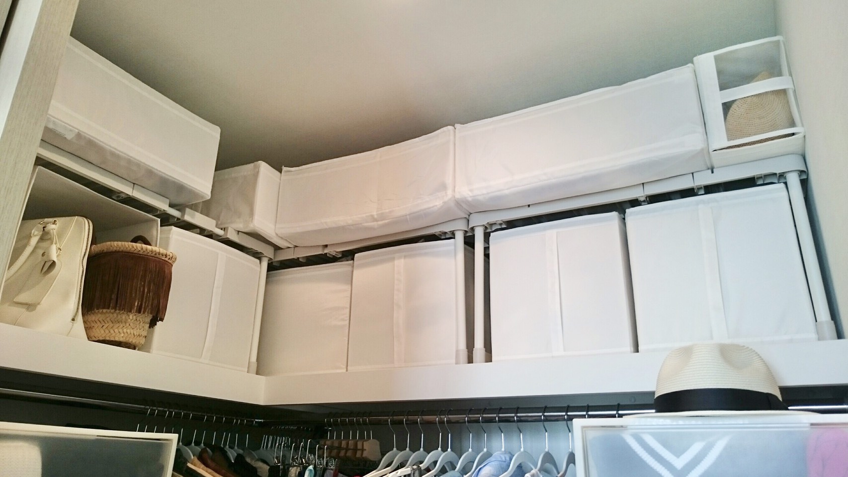 クローゼットの棚の上にはIKEAの「SKUBB」にシーズンに合わない衣類や、布団類、ブランケットなどをメインに。通気口があるのでカビにくく、使わない時は折り畳んで収納できるのがポイント。旅行時はスーツケースにまるごと入れると小分けに収納できて便利!収納棚にずらっと並べても圧迫感のないクリアな白なので、収納スペースが狭い人にもイチオシです。
