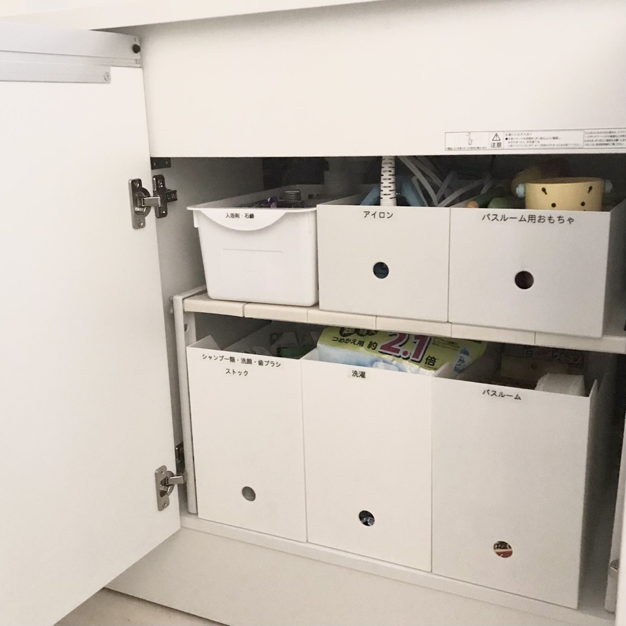 洗面台の下にはストック類一式を。下の段のボックスはニトリ、上の段は無印良品のボックス。同じように見えますが強度と値段が違います。収納ボックスで一番頑丈だと個人的に思うのが無印良品、お手頃なのはニトリです。