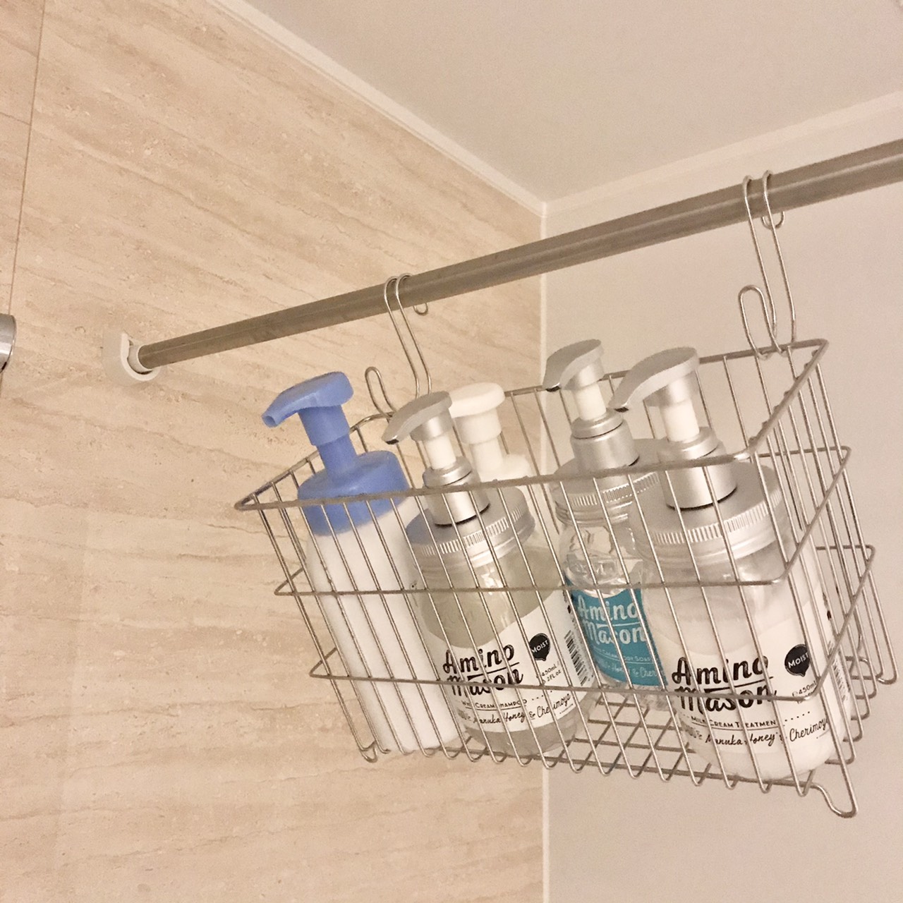 バスルームの空中収納その2。無印良品の「ステンレスワイヤーラック」と、「横ブレしにくいフック」で吊るしています。使うものはすべて1つ残らず空中収納にしておけば、床掃除もスムーズですぐに終わります。