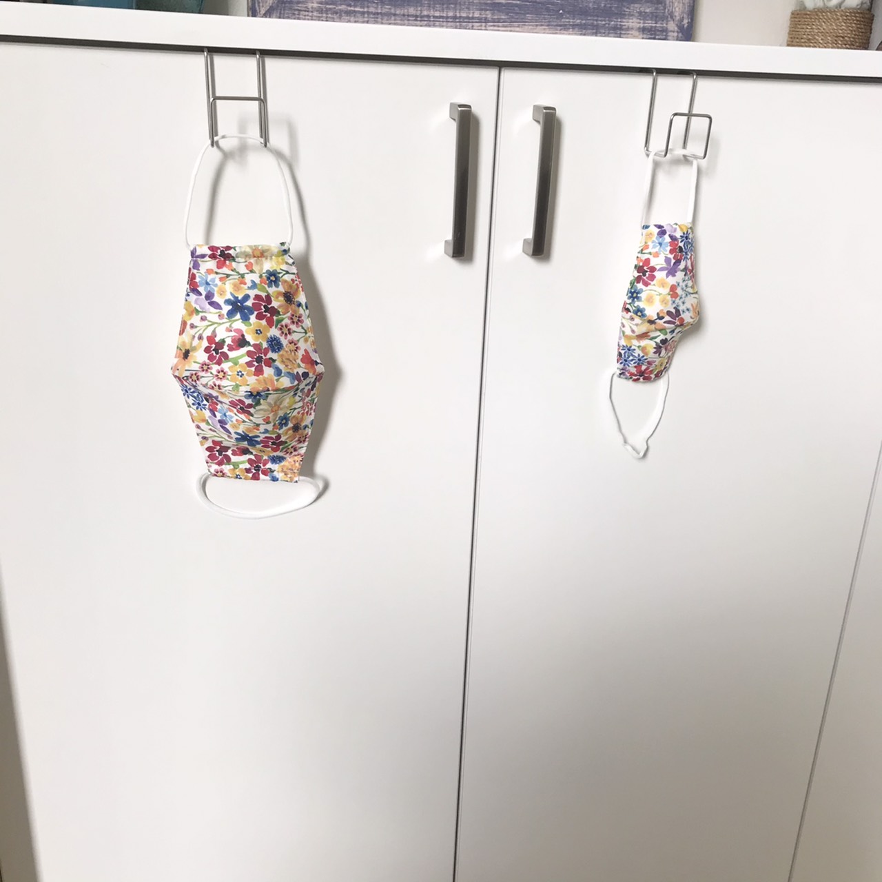 無印良品のフック類は本当に優秀で、玄関周りでも大活躍。部屋のあちこちに置きがちなマスクもごらんの通り。