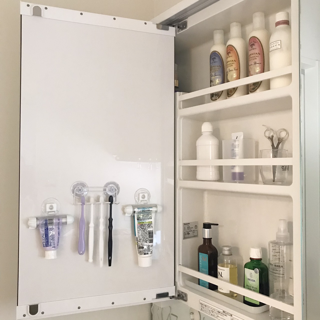 扉を開けるとこんな感じです。昔は使ったり使わなかったりのコスメや、置いておくと可愛いボディケアグッズなどを入れていたのですが、今は毎日必ず手に取るものだけ厳選して並べ、使用頻度の少ないものは棚へ移動させました。