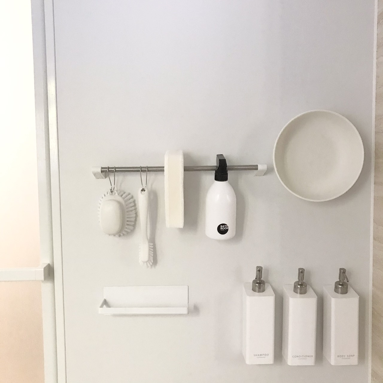マメに掃除をしない私のストレスポイントだったのがバスルームのカビ。ボトル類や掃除道具のカビやヌメリって本当にイヤですよね。ボトルを移動して床を磨くのも億劫で•••。思い切ってバスルームにある全てのモノの直置きをやめました!備え付けの棚を外し、マグネット付きの桶(MARNA マグネット湯おけ 磁石 ホワイト)と、マグネット付きの詰め替え用ボトル(山崎実業 TOWERシリーズ)に変更。