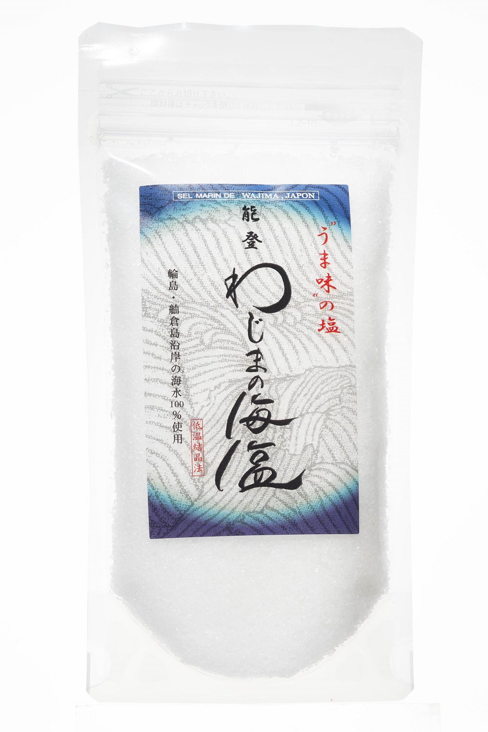 【わじまの海塩】能登の輪島沖50㎞の清浄な海水を100%使用。理想的なミネラルバランスと豊かな旨味でミシュランの星付き懐石料理店をはじめ有名レストランも愛用。わじまの海塩100g ¥500(美味と健康 http://www.wajimanokaien.com/ )