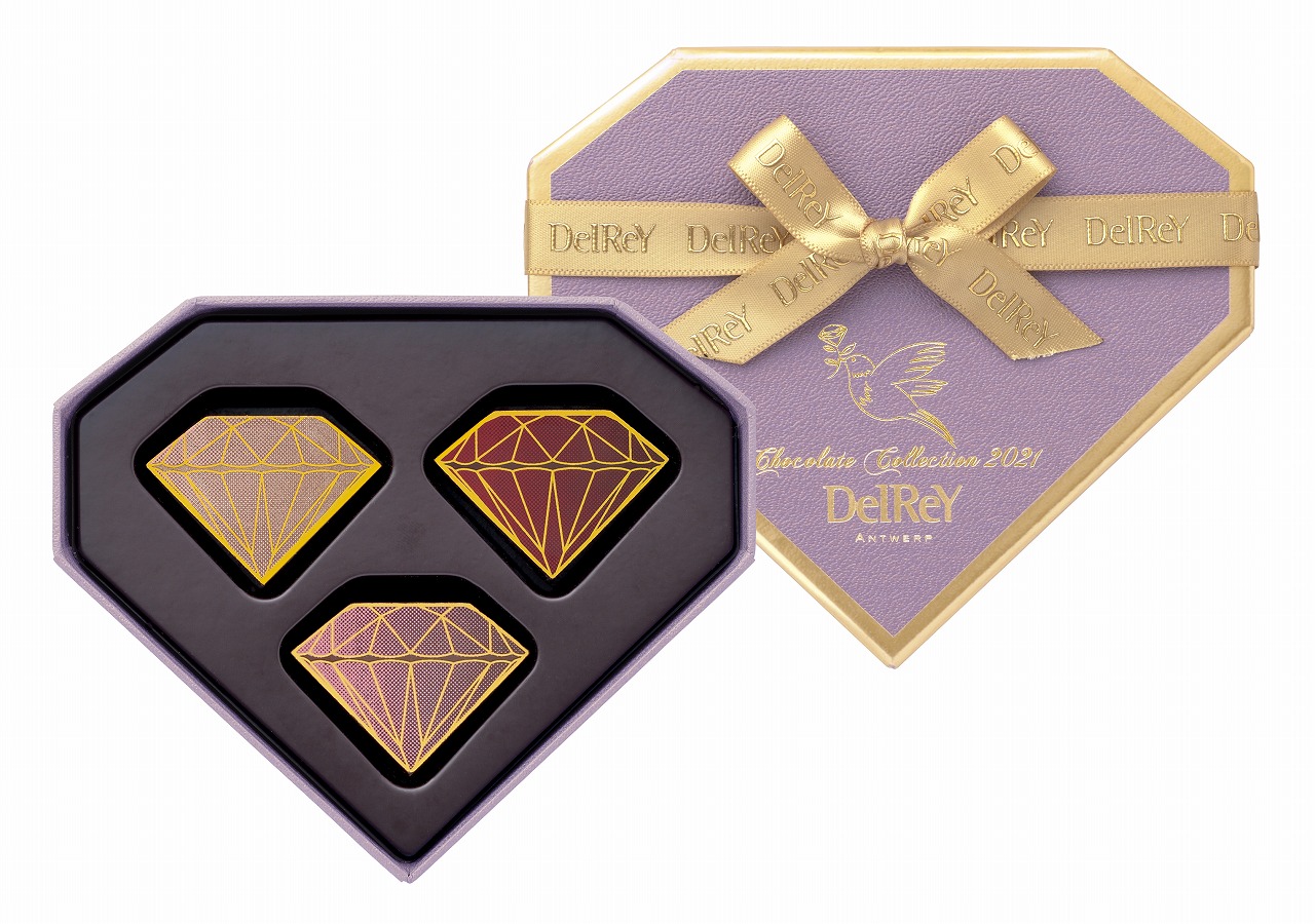ときめかずにはいられない、デルレイの代名詞とも言えるダイヤモンドショコラの新フレーバーを詰めた2021年限定BOX。フレーバーは左からキャラメルのガナッシュが入ったミルクチョコレート、パイナップルやマンゴーのガナッシュが入ったダークチョコレート、トンカ豆の風味漂うダークチョコレート。食べ応えのあるサイズ感も嬉しいポイントです❤️
