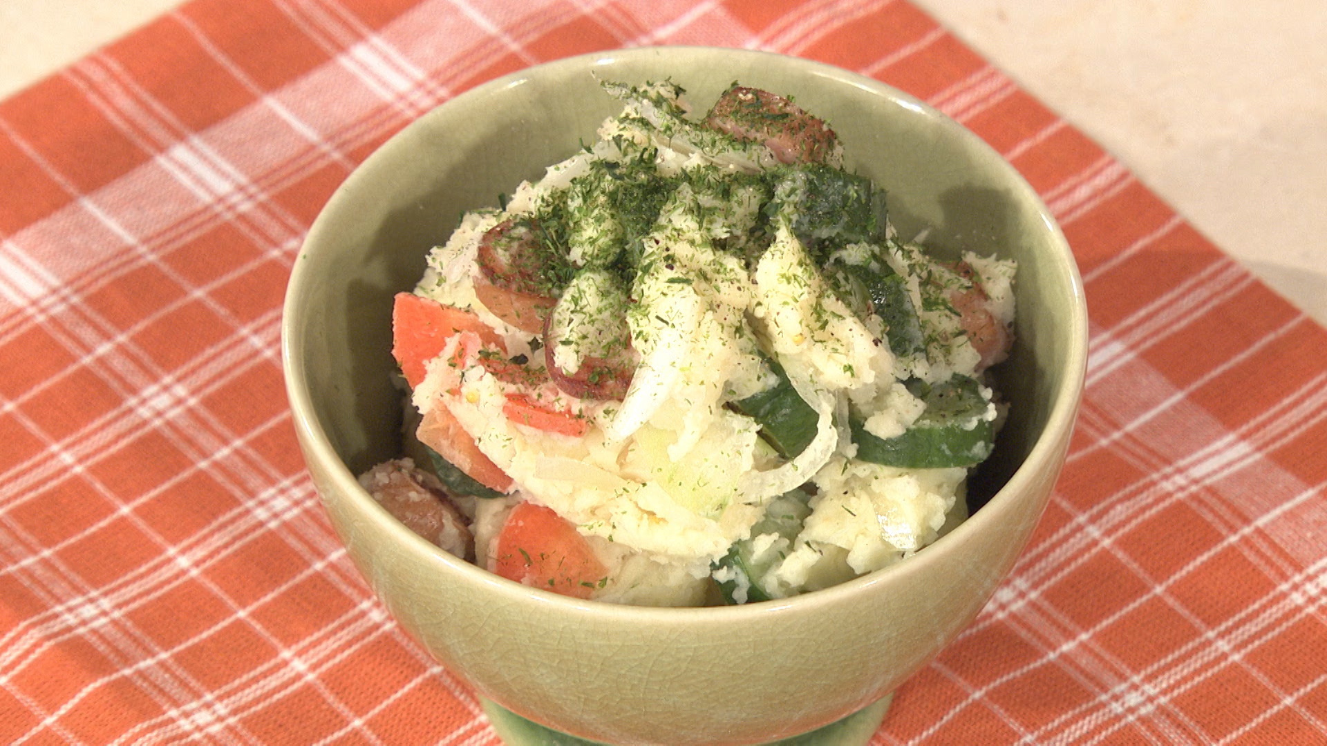 ②じゃがいもを茹でている間に、具を準備する。ぬか漬けのきゅうりとにんじんを薄切りする。玉ねぎも薄切りして、塩少々をまぶして揉み、水と氷を加えて浸し、辛みを抜く。10分ほどおいたらザルにあげ、水気をよく絞る。ソーセージは小口切りにして炒める。