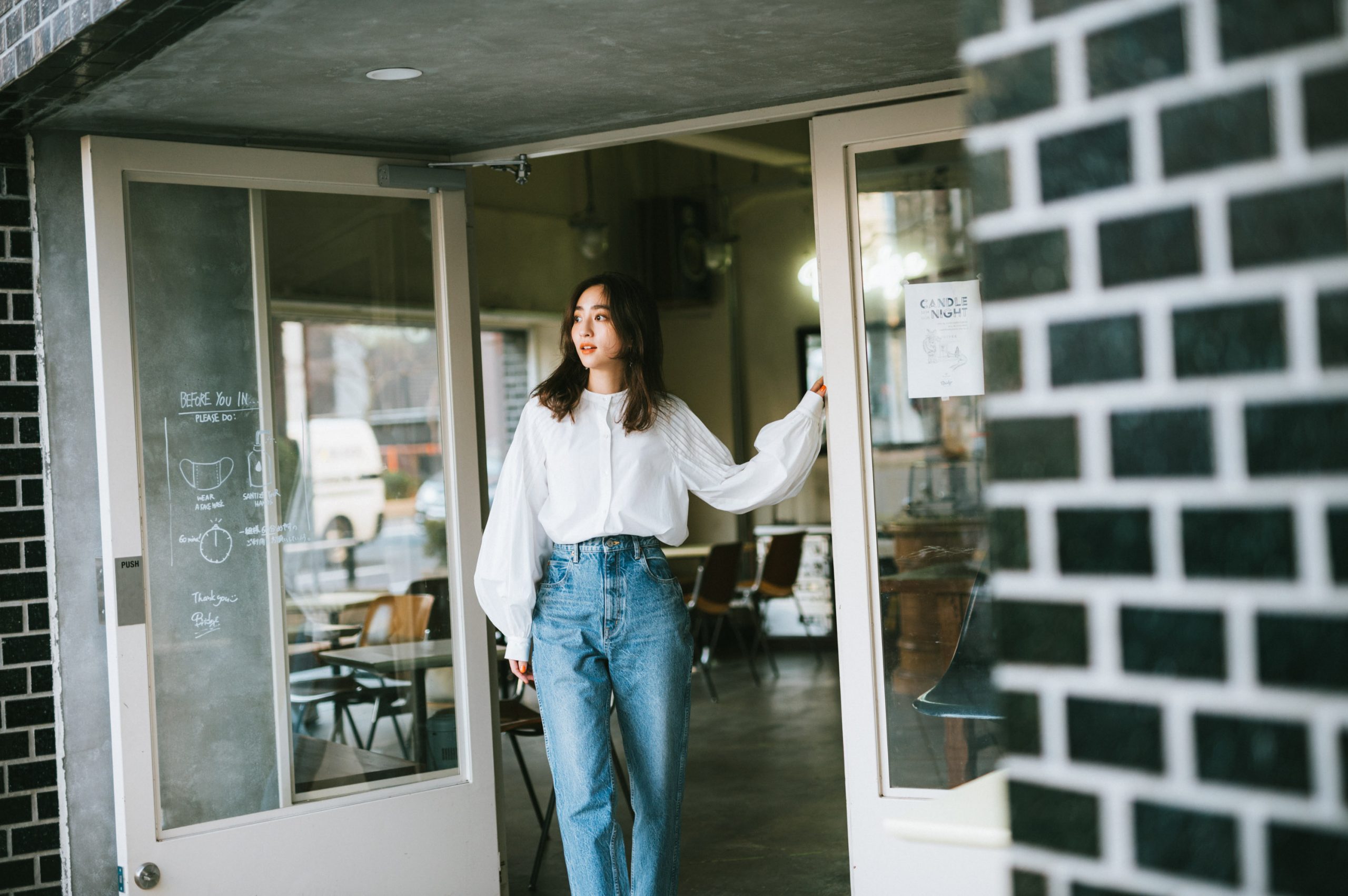 ブラウス¥20,000(エトレトウキョウ)デニムパンツ¥19,000(THE SHINZONE/Shinzone LUMINE YURAKUCHO)パンプス¥44,000(ネブローニ/フラッパーズ)ピアス¥15,000(ルフェール/UTS PR)パールリング¥8,500(エナソルーナ)ゴールドリング¥148,000(マリハ)