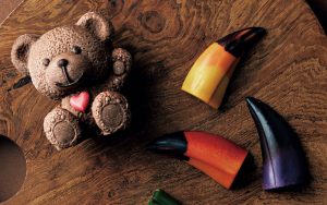 「Hi♥と挨拶してくれているかのようなポーズと赤いハーFトが可愛い。こういう時期だからこそ、可愛らしいチョコをお家時間の心の癒しにしたいです」カカオ40%のミルクチョコレートとダークチョコレートを使用し、熟練の職人が一点一点手作りで、くまのふわふわな毛なみまでを再現しています。大きさはW55×D50×H60㎜ほど。¥2,700(CACAO SAMPAKA丸の内本店)