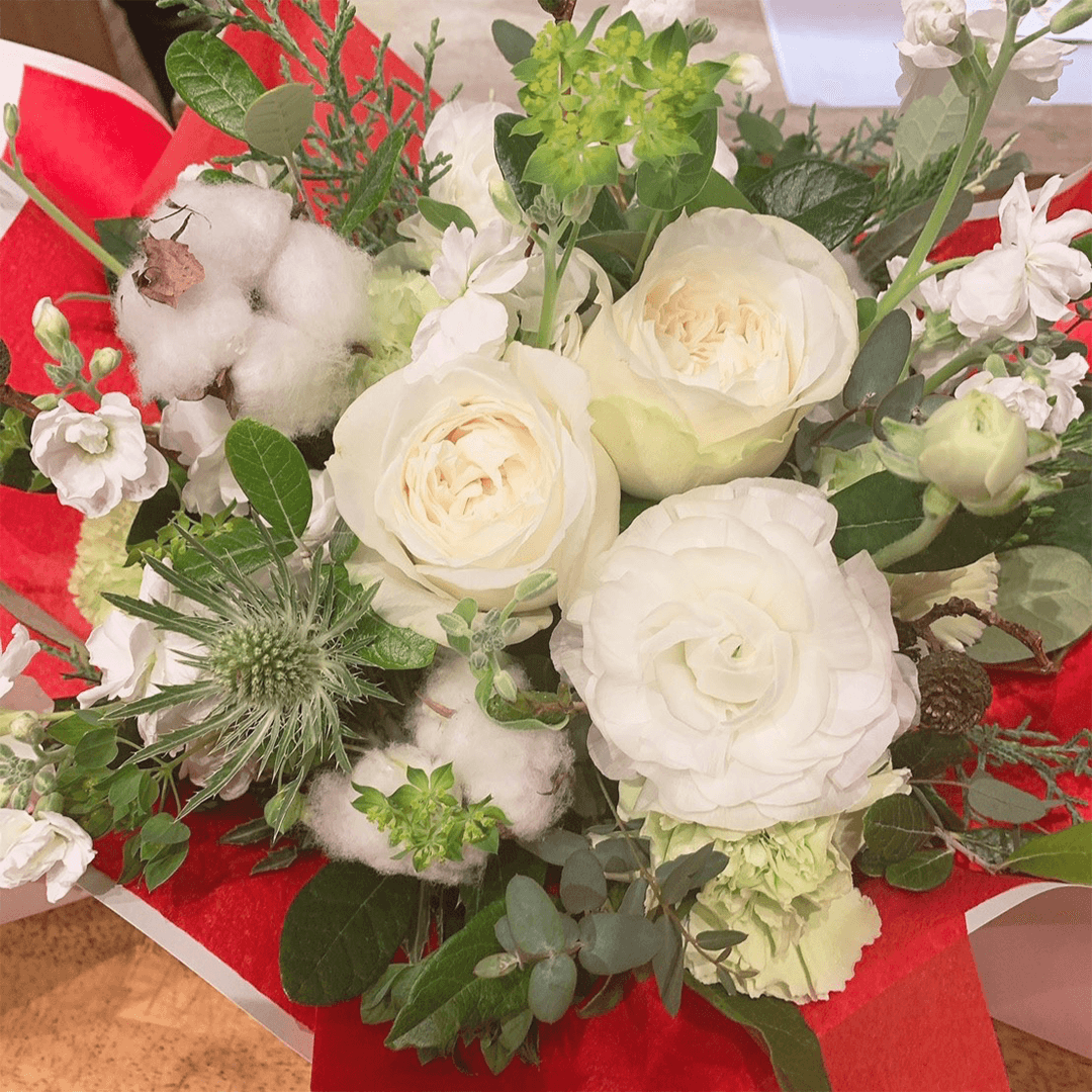 撮影時の私服も赤いニットだったので「服に合ってる!」と現場で話題に。お花の紙袋を持ってサンタのようなポーズを取ってくれるサービス精神ばっちりの松村さん。その姿をみなさんにお見せできなくて残念です…。