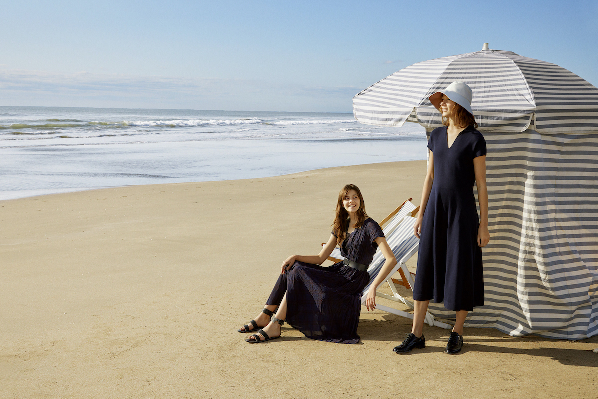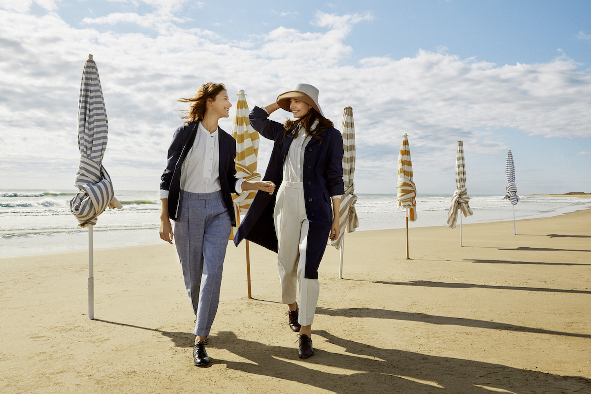 ドーヴィルへの小旅行にインスパイアされたアイテムは、リネンコットンのセットアップやポインテールニットからスタイリングのアクセントになるスカーフやベルト、バッグまでバリエーション豊か。コラボレーション初となる、UV カット機能のついたハットも登場します。