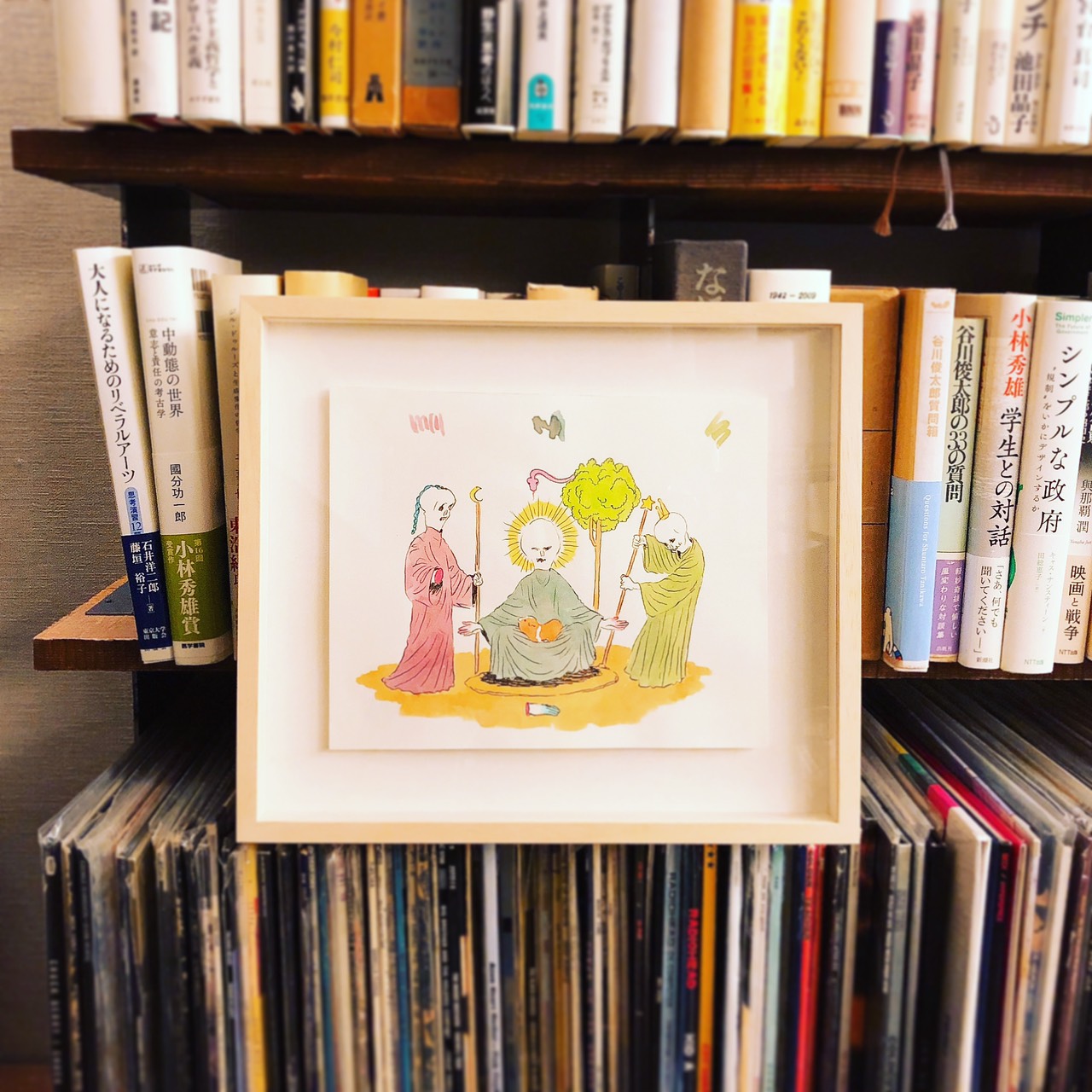 「個展で購入した我喜屋位瑳務さんのドローイング。一つ一つの線がとても気持ちよく引かれていて、眺めるたびに手描きのエネルギーを感じて嬉しくなります。そして毒っ気のあるユーモアとポップな色合いも素敵! 本棚に無造作に置いて楽しんでいます」