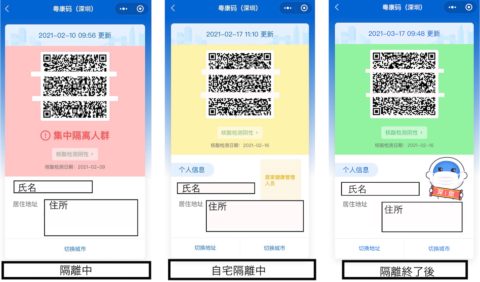 中国では省ごとに『健康コード』の登録が義務付けられ、人が多く集まる商業施設や駅などで提示を求められます。写真のようにステータスごとに色分けされているので、一目でその人が健康かどうかわかるようになっています。また、スマホの位置情報と連動しているので、万が一感染者と濃厚接触があった場合もグリーン(健康)から赤に色が変わります。