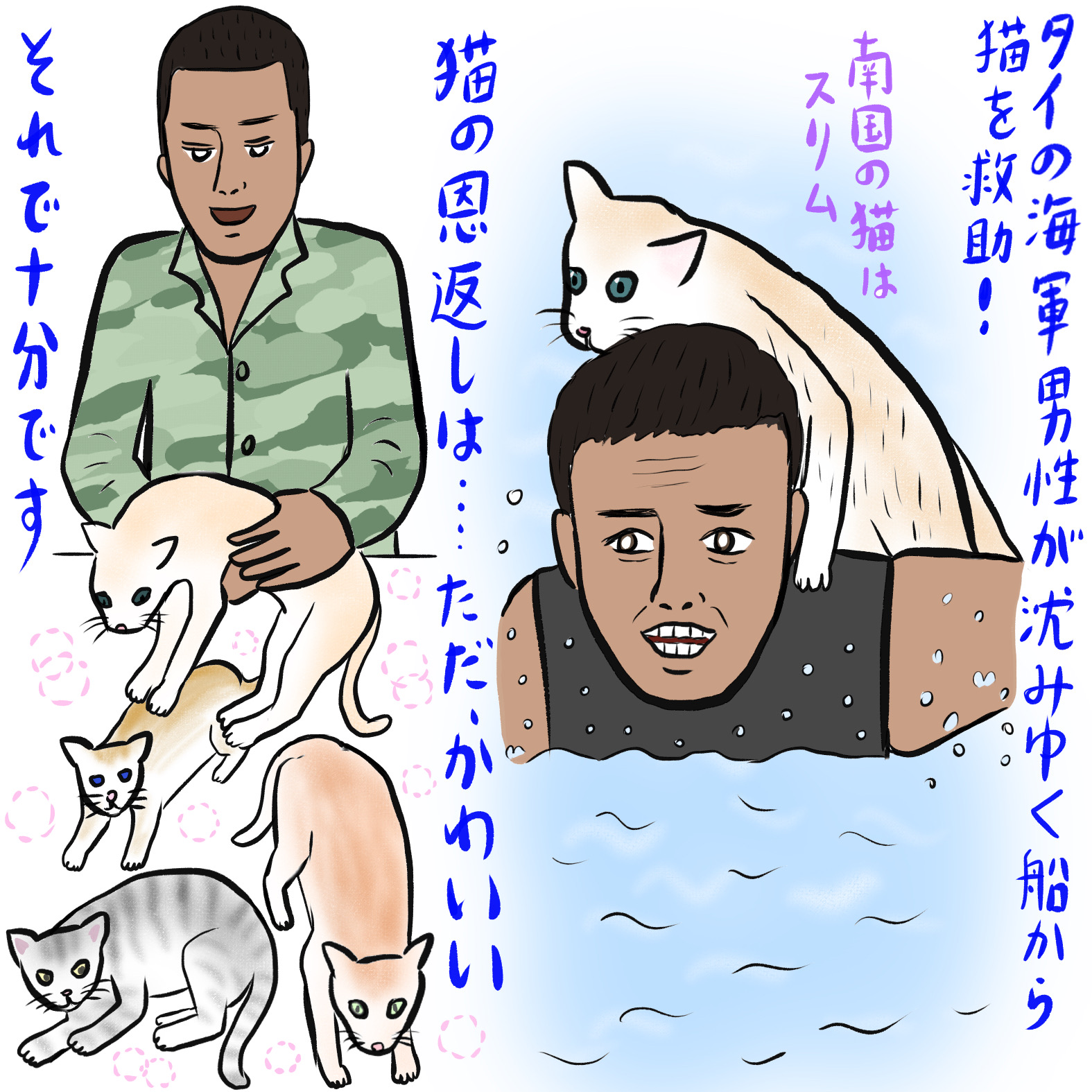 全世界が泣いた……タイ海軍の海兵隊員が沈みゆく船から猫たちを助け出したニュースが地球をかけめぐりました。3月2日、タイ・サトゥーン州のアダン島沖で航行中のトロール船が炎上しているという通報で駆けつけたタイ海軍。彼らが乗組員を救助し、再度、船から油が漏れていないかを確認しにいくと、船の上部構造に乗って不安げにこちらを見つめる4匹の猫たちが! なんとしても猫を救わなければということで、果敢にも水に飛び込んだ海兵隊員。泳いで船に行き、猫を肩に乗せ、袋に入れて泳いで戻って無事に救出。それからしばらくして船は沈んでしまったそうです。この、猫を肩に乗せて救助する写真を見ると猫のかわいさ、海兵隊員のかっこよさ、そして感動のハーモニーが押し寄せてきます。日焼けしたイケメンの真剣な表情とマッチョで頼りがいのあるボディが目を引きます。今年のピュリッツァー賞はこれで決定でいいのでは? と思えてきます。