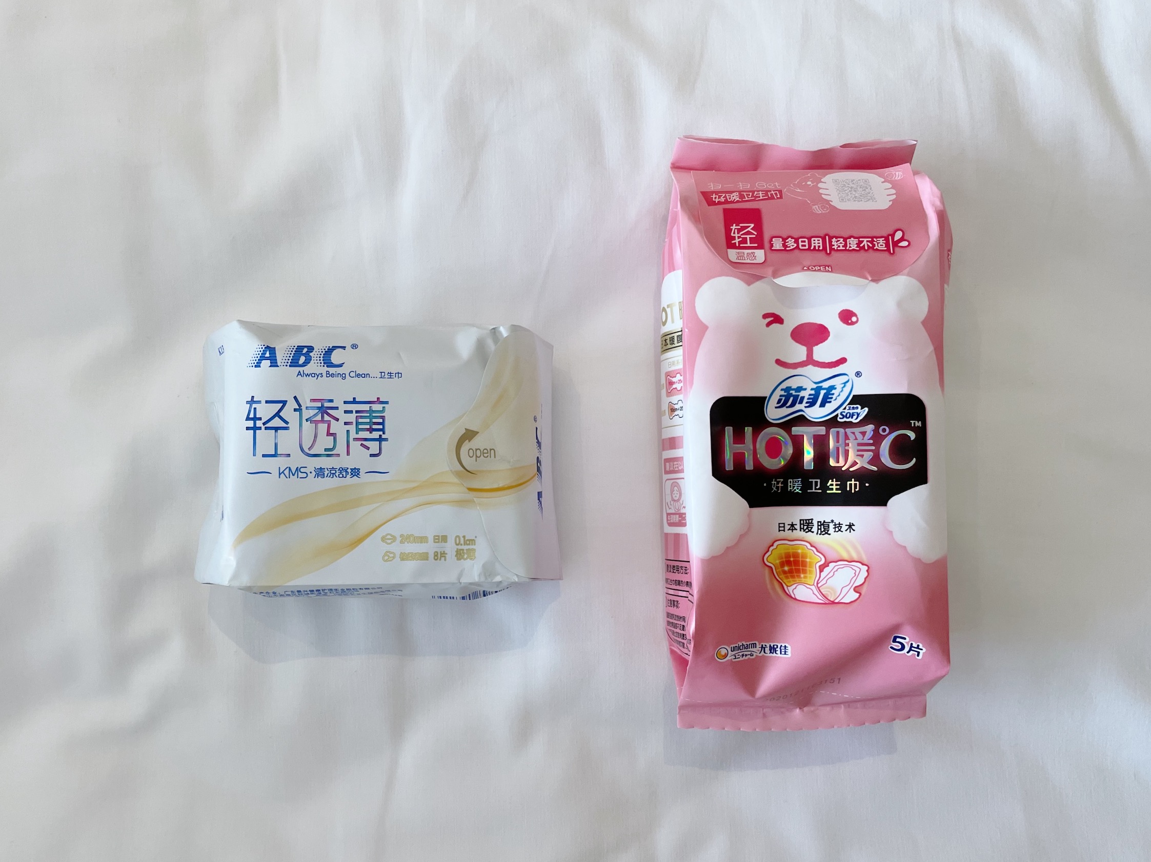 中国で生理用品を購入した際、驚いたのは日本メーカーの製品の多さです。中国では日本メーカーが現地で製造する生理用品や輸入した日本製の生理用品が人気を集めているようです。写真左が現地メーカー『ABC』の人気商品で、写真右が日本メーカー『ユニ・チャーム』の現地製造商品です。中国の現地製品は、パッケージがかなりシンプルで、薄くて軽い印象。日本メーカーの現地製造商品は、パッケージがカラフルで機能性重視だと感じました。
