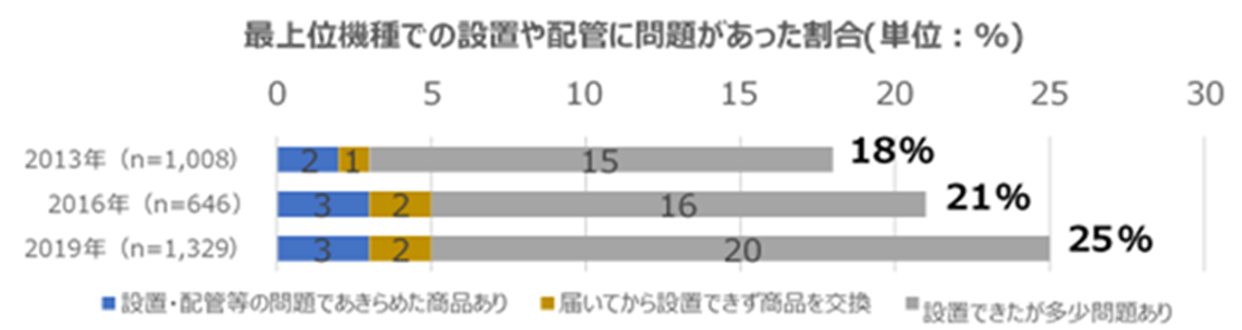 試運転をしてエアコンの買い替えを検討する場合、本格的な暑さが来る前の、“工事 は立て込んでいない時季”に、“買い替えも早めに”済ませておきましょう。そして買い替えの際、お店に行くまえにチェックしておくポイントがあります。このチェックをしないまま購入すると、いざ取り付ける際に「室内機 が入らない!」という設置トラブルが起こることも。実際に、エアコンの設置の際に問題があった割合が2013年は 18%だったのに対し、2019年は 25%と増加しているので要注意です!
