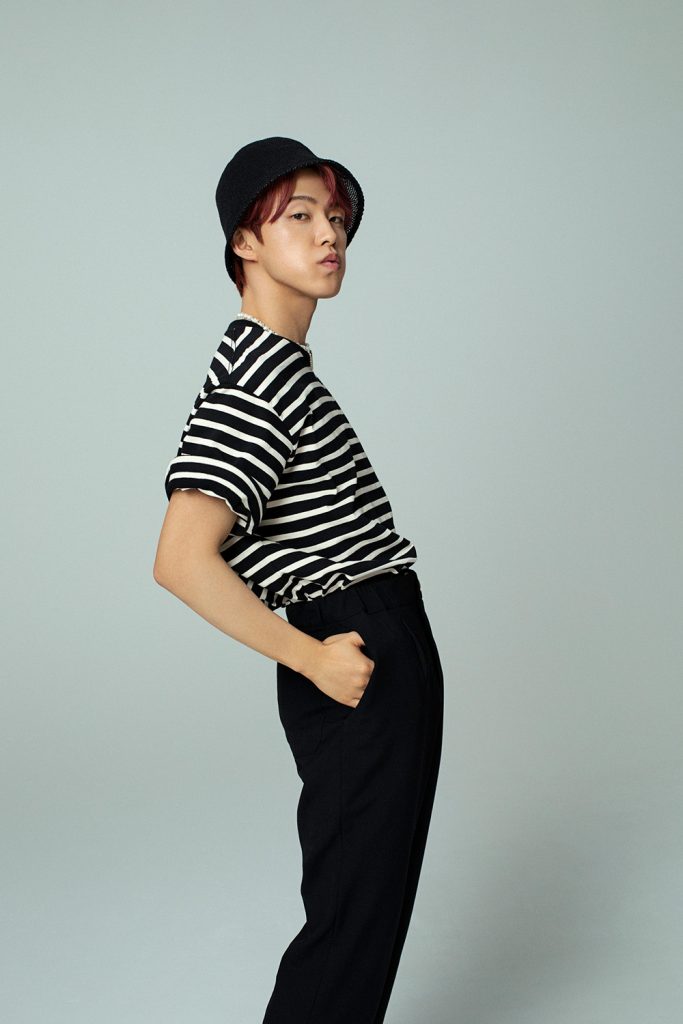 Tシャツ¥19,800(サイベーシック/マスターピースショールーム tel. 03-5414-3531)パンツ¥28,600(ディガウェル 1 tel.03-5722-3392)パールネックレス¥19,800ネックレス¥11,000(ともにジエダ/キクノブ 東京 tel.03-6455-0535)ハット¥8,800(ナイン テイラー/スタジオ ファブワーク tel.03-6438-9575)靴¥20,900(スペース クラフト/HEMT PR tel.03-6721-0882)