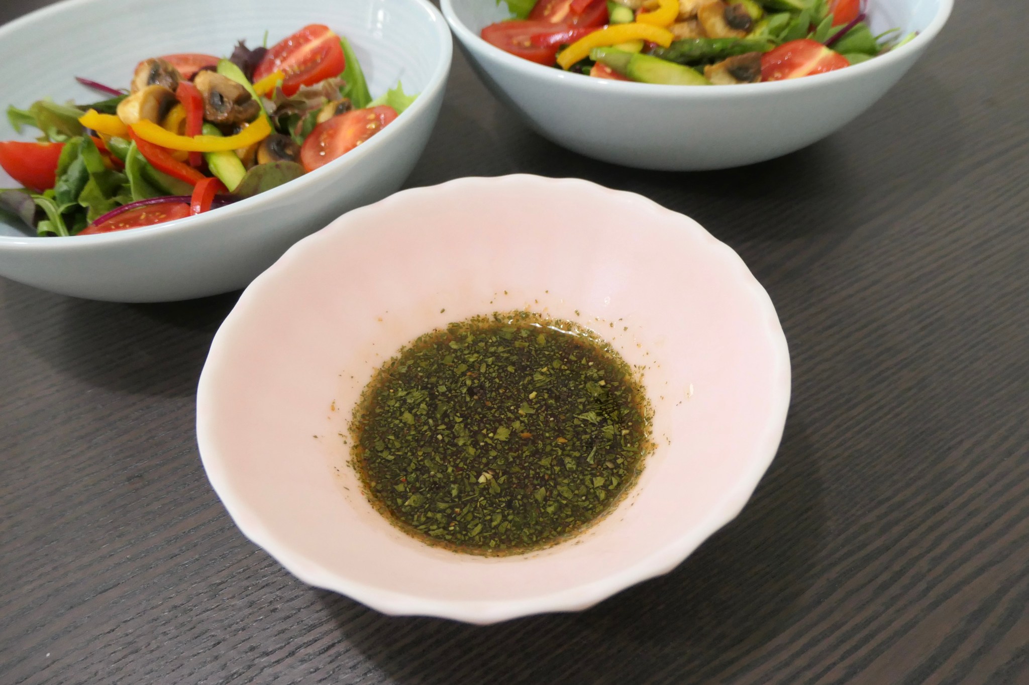 材料を全て混ぜ合わせるだけなので、レシピもいらないぐらいです!ガーリックパウダーとドライパセリが少しなじんだ方が好きなので、10分ほど置いてからサラダにかけています。