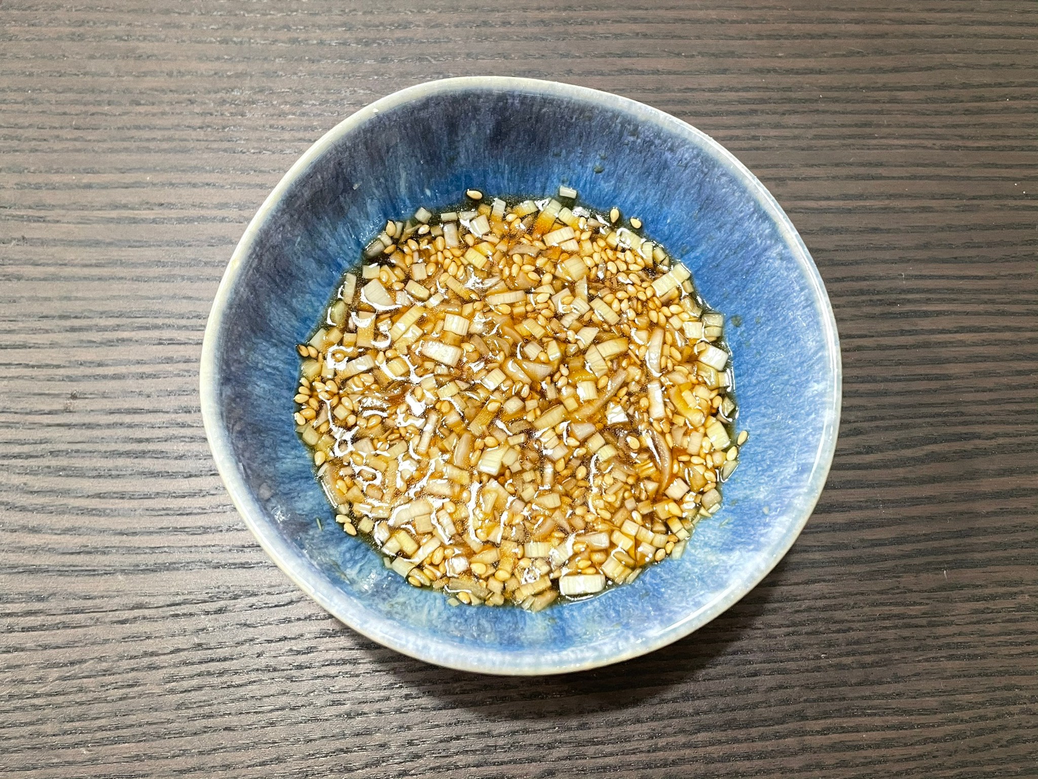 ネギは細かく切ります。細かく切ったネギとゴマと調味料を混ぜ合わせて、10分ほど置いてなじんだら完成です!