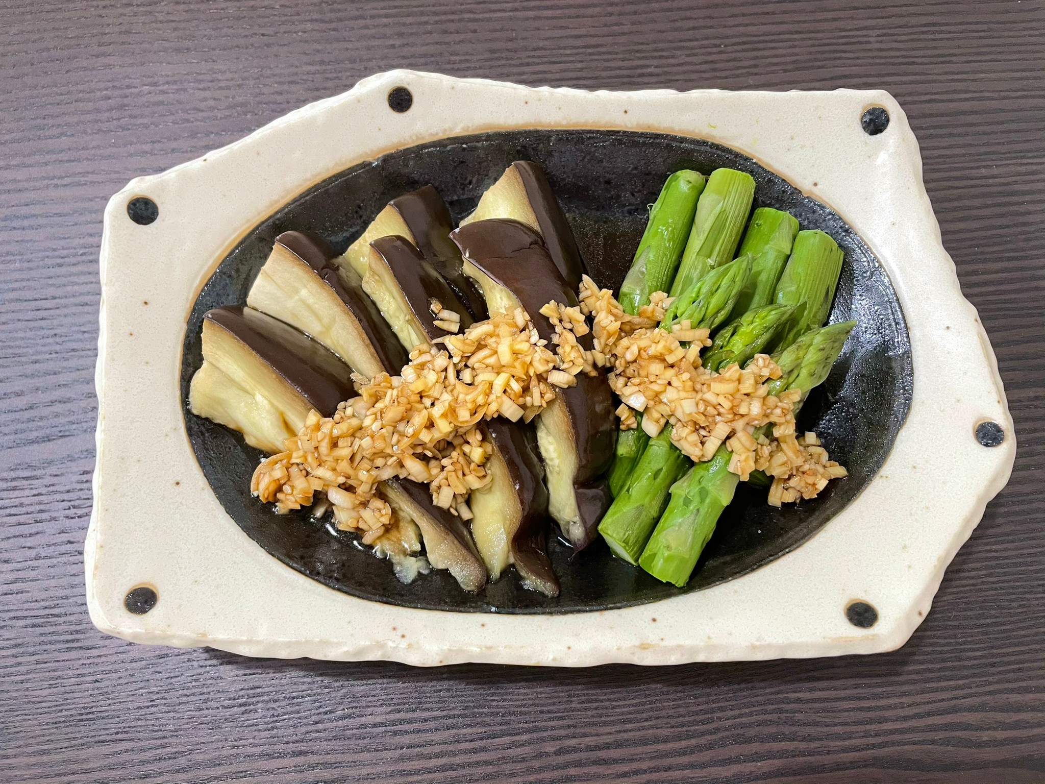 我が家ではこのタレを、温野菜にかけたり蒸し鶏のつけダレにしたり、冷奴にかけたりして使っています。この日は、電子レンジで加熱しトロトロにした茄子と茹でたアスパラにかけて食べました。