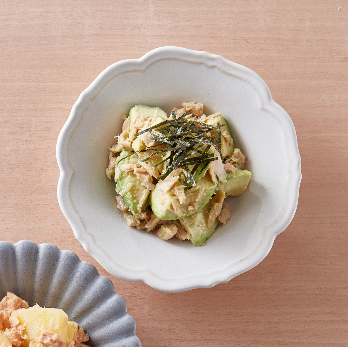 ①ボウルに、ひと口大に切ったアボカドと、汁けを切ったツナを入れる。