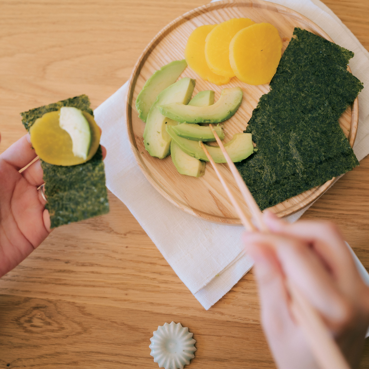 ②のりにアボカドとたくあんをのせ、包んで食べる。