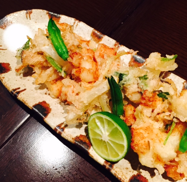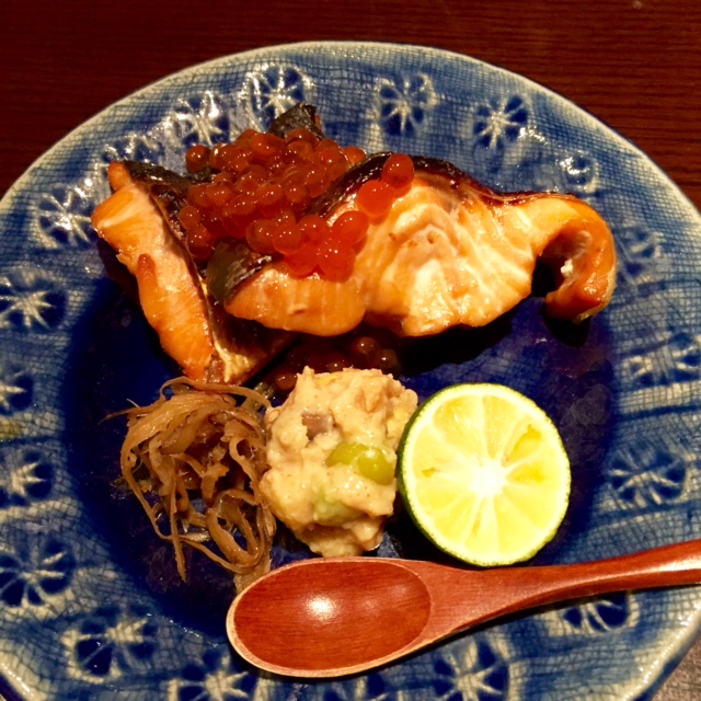 メニューを見た瞬間に「端から全部持ってきてちょうだい!」って叫びたくなるくらい美味しそうな料理がズラリ。箸をつける前になんとか正気を保って撮れたのが「トリュフなじゃがいもフライ」、「秋しゃけのつけ焼きいくらがけ吹き寄せみそソース」、「かも肉、柿、しいたけほう葉みそ焼き」、「ホタテとアワビ茸しょうがのかき揚げ」で、他にも頼んだのですが、気がついたらなくなってました。