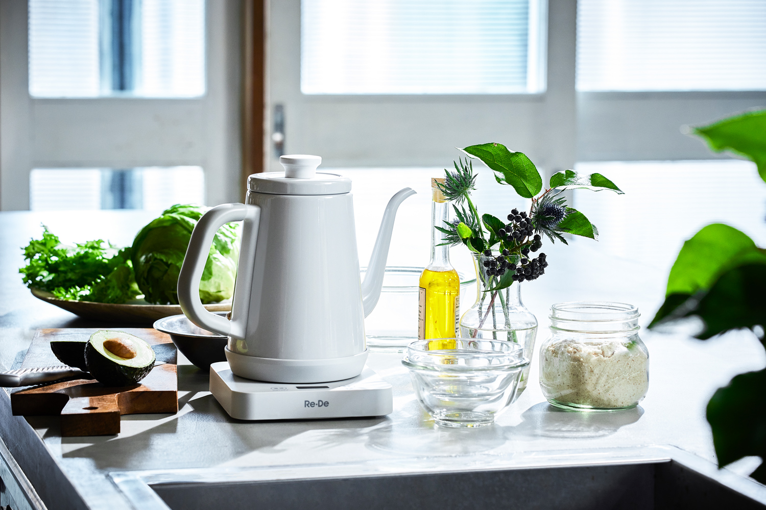 そんな大人気ブランドに、6月25日(金)に仲間入りしたのが、調理をサポートする電気ケトル「Re・De Kettle」。標準的な電気ケトルよりもやや大きめの1Lサイズで、たっぷりお湯が沸かせるのはもちろん、50・60・70・80・85・90・95・100℃の8段階の温度調整機能を搭載し、用途に合わせてお湯の温度を調節可能。ただお湯を沸かすだけじゃない、賢さを備えたケトルなのです。ホーローを思わせる質感や持ち手の曲線形など、インテリアとしても優秀なおしゃれデザインも◎!
