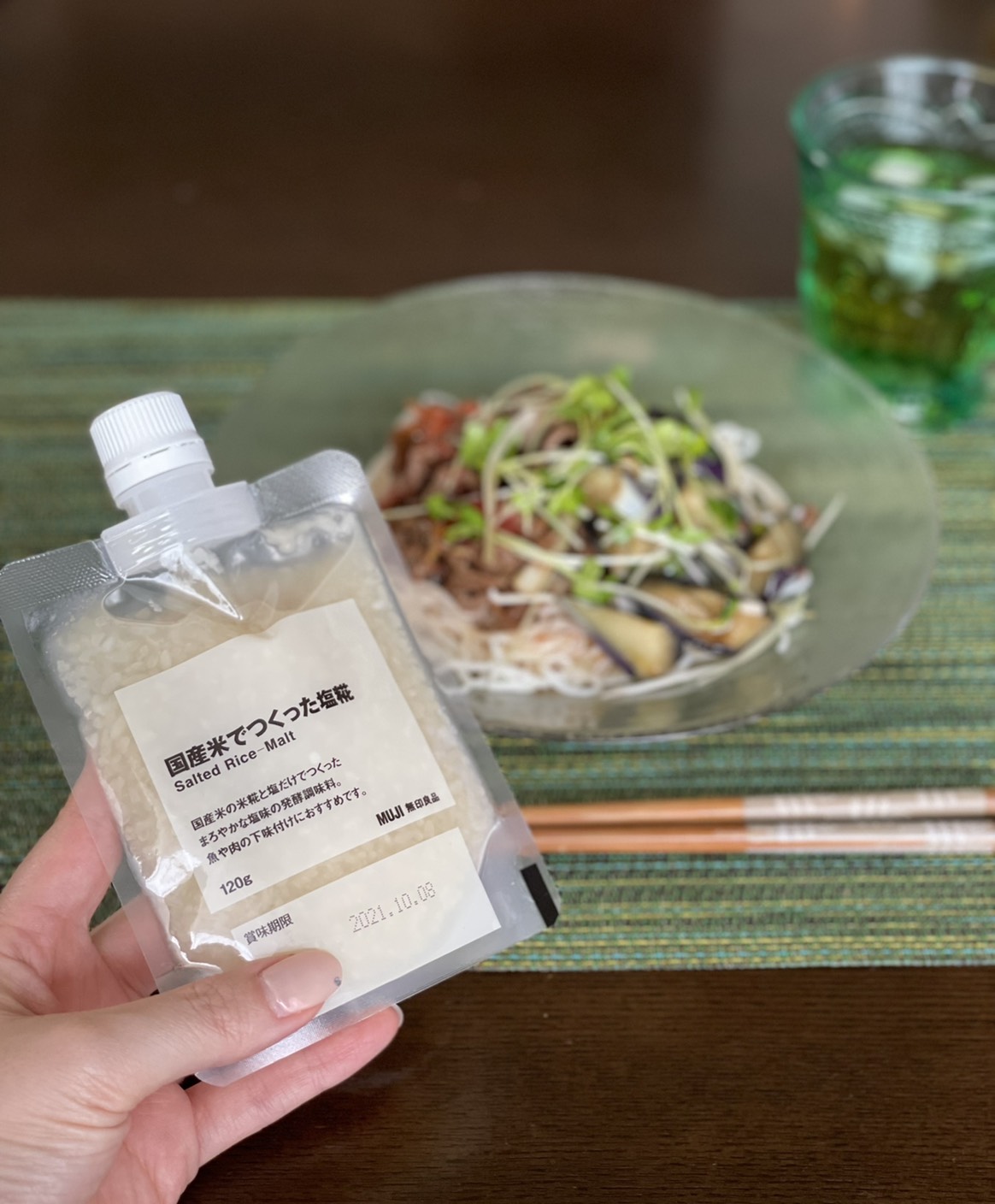 加治ひとみさんの取材で出会った万能調味料の「塩麹」。腸内の善玉菌のエサとなり、腸内細菌のバランスを改善してくれます。SNSで「便利で美味しい!」という口コミが気になっていた、無印良品の塩麹を買ってみました。原材料は国産の米と塩のみといたってシンプル。自宅で牛肉とトマト炒めと茄子の煮浸しの素麺を作るときに、下味をつけるのに塩麹を使いました。野菜の甘みがグッと引き立ち、味が引き締まります。