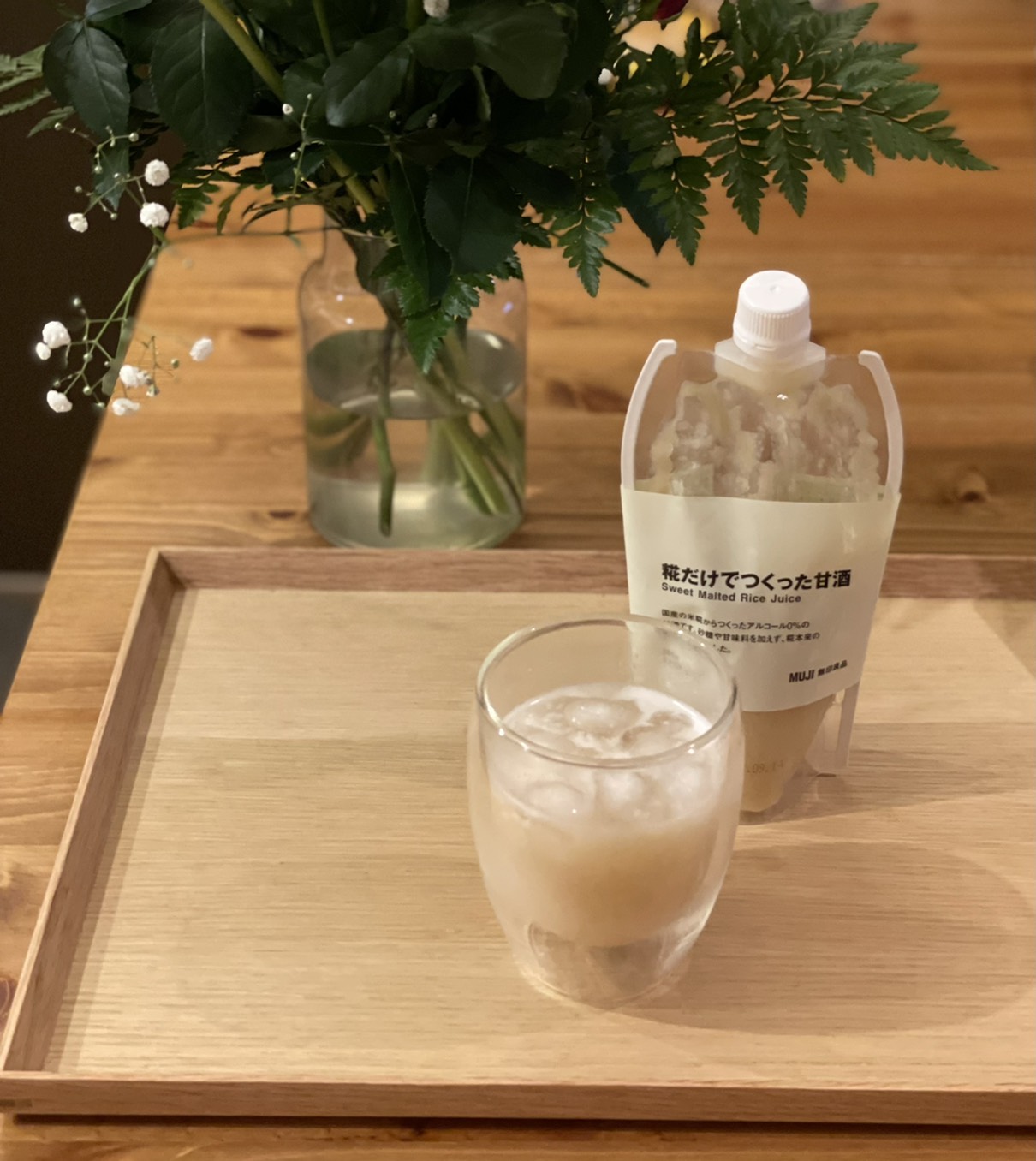 無印良品の甘酒は2倍濃縮タイプなので、私は辛口のジンジャエールと割って飲んでいます。甘すぎず、しゅわっとして美味しい!麹が重みで下に溜まってしまうのでよく混ぜて。お腹もいっぱいになるので、急いでいる日の朝食代わりにすることも。