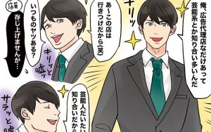 食事中も「社内コンペで一位をとった」「ヘッドハンティングされている」など、話はとまりません。何が本当か嘘か分かりませんでしたが、聞き流していました。ただ、どう考えても嘘だなと確信したのは「昔、某大手芸能事務所に所属していた」という話。普段から本物の有名人と多く関わる仕事に就いている分、彼にそちら側のオーラがあるとは到底思えなかったのです。長々と話を聞いていた私の頭に、意地悪心が働きました。知り合いに有名人がいるので、カマをかけようと「○○さん知ってます?」と言ってみました。すると「あいつ友達だよ」と秒で返してきたので、ここぞとばかりに「私仲いいんです!今度一緒に飲みましょ う!」と言ったら、突然歯切れが悪くなる彼。…嘘確定。そこからしつこいアプローチは収まりました。(30歳・マスコミ)
