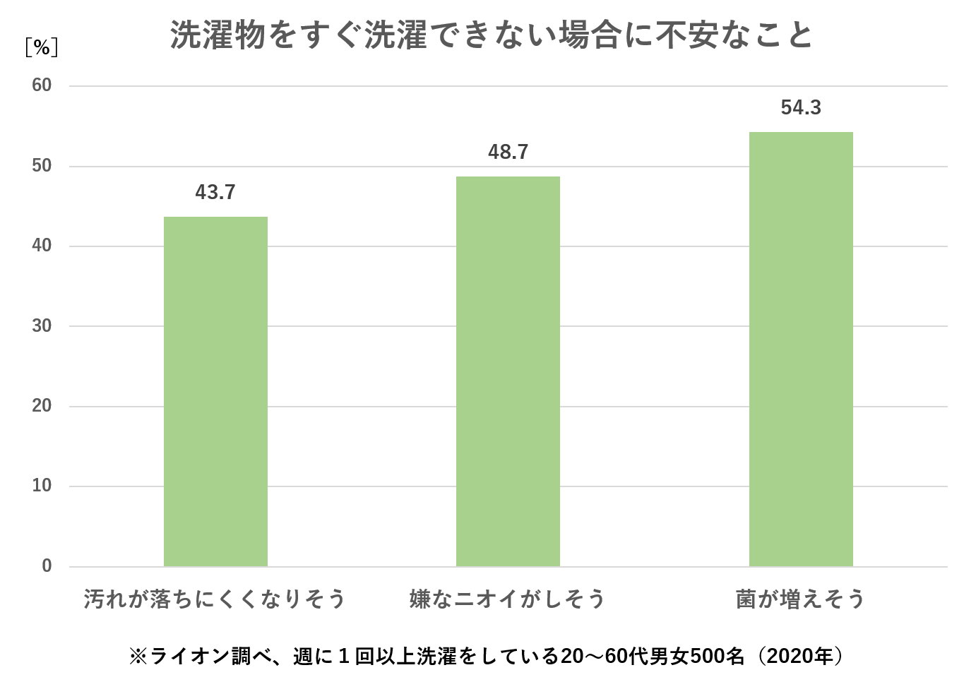 「⾐類はこまめに洗濯する」ことが望ましいことはわかっているものの、毎日お洗濯をする家庭でも、「Yシャツは他の洗濯物とは分けて、週に1回まとめ洗い」とか「おしゃれ着は、週末にある程度枚数がたまってから洗う」など、すぐに洗わないで洗濯カゴに置いているアイテムもあるかもしれません。⼀方で、「菌が増えそう」「イヤなニオイがしそう」「汚れが落ちにくくなりそう」とすぐにお洗濯できないことに対する不安やストレスを抱えている⼈がいます。(図ご参照)また、放置することに不安を感じるアイテムとしては、肌に直接触れる下着やマスク、濡れたまま放置しがちなタオル、エリや袖口が汚れやすいYシャツなどが挙げられました。